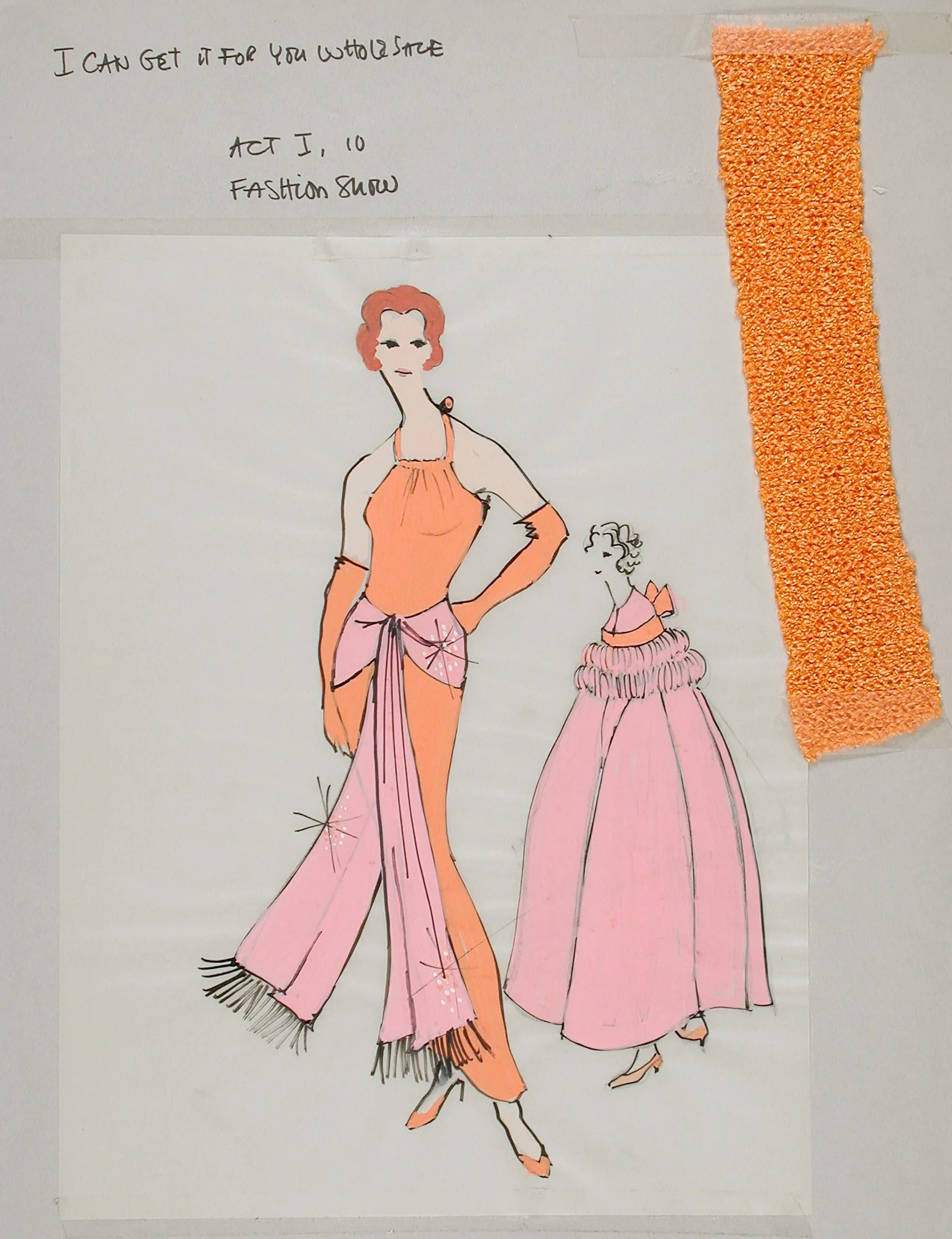 Costume design drawing in black ink and pink and orange watercolor, showing two fashion figures in halter and ball gown designs, with a fabric swatch attached