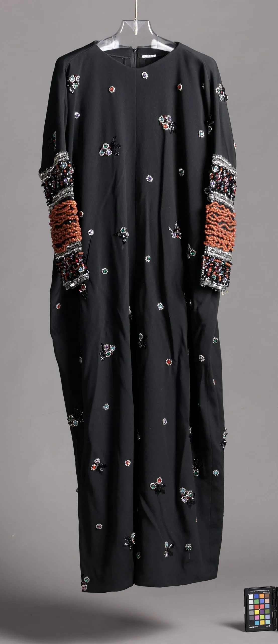 - Silk plain weave (crepe) with glass and plastic beads, paste stones, sequins, and crystals
