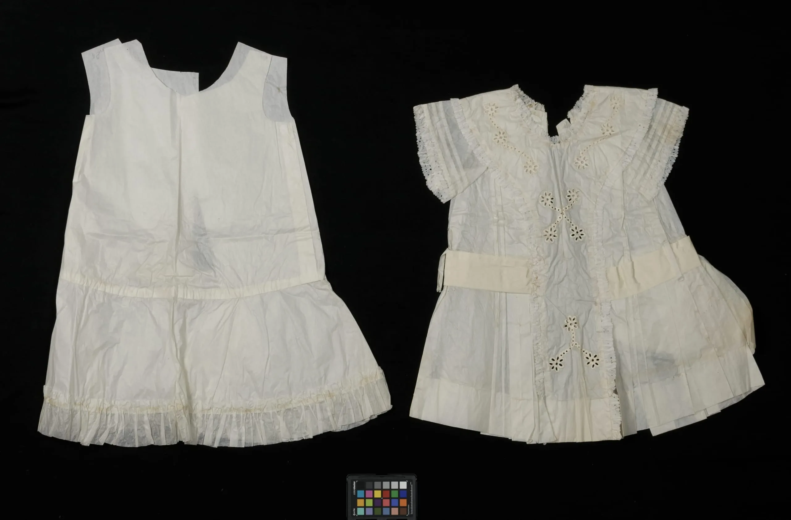 Two small white children's garments laid flat on a black background: a sleeveless slip with lace-trimmed hem and a short-sleeved dress with broderie anglaise cutwork decoration