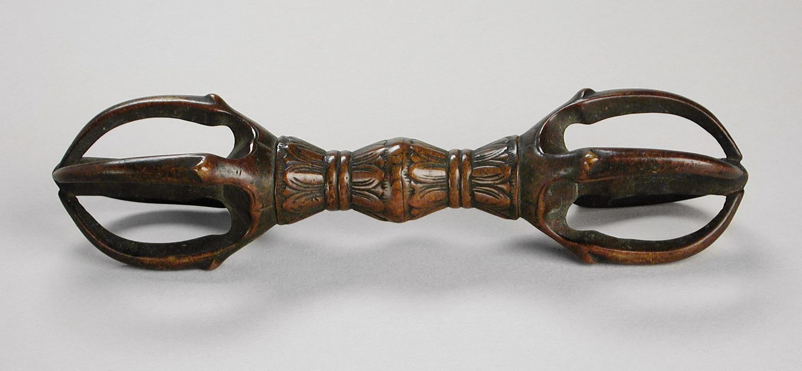 Cast bronze ritual object with two symmetrical four-pronged ends flanking a decorated central grip, with dark patina and reddish highlights