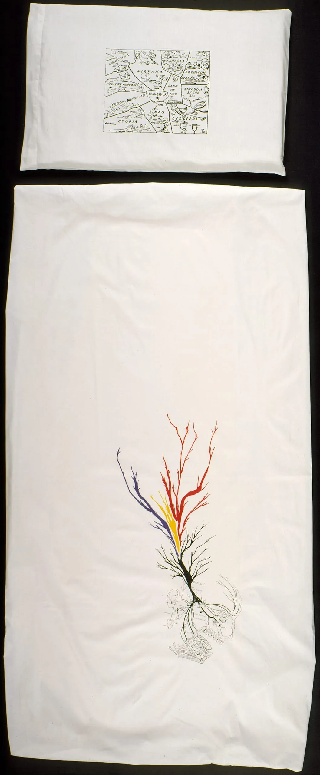 - Screenprint on standard twin fitted sheet and standard twin pillowcase (50% polyester, 50% cotton)