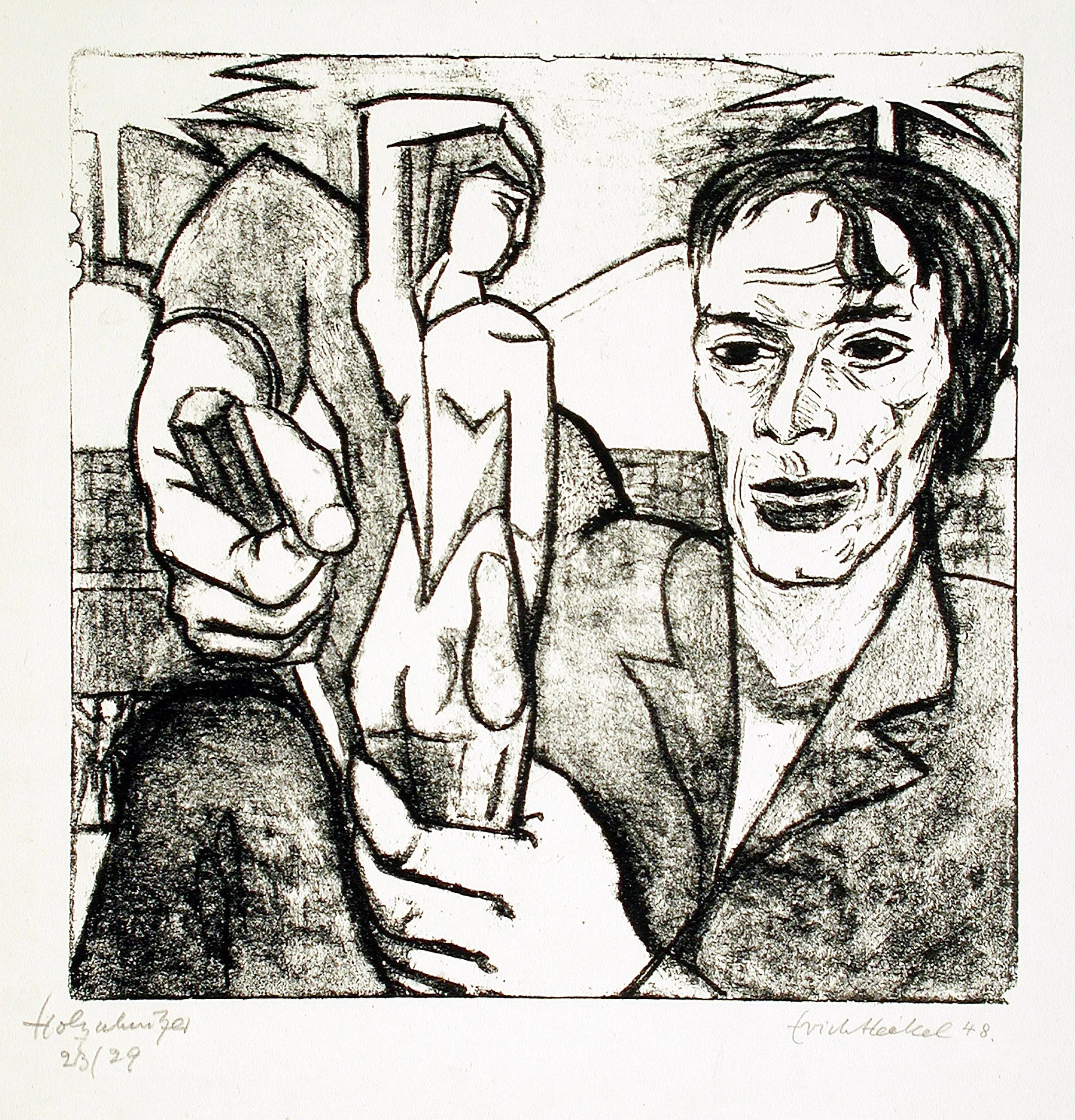 This portrait is a tribute to Ernst Ludwig Kirchner, Erich Heckel’s friend and fellow member of the German Expressionist group Die Brücke (The Bridge). Kirchner, who had died by suicide in 1938, is shown carving a sculpture not unlike his Dancer with Necklace, also in LACMA's collection. Heckel made this portrait three years after the end of World War II and more than three decades after the dissolution of Die Brücke. It was a moment of reassessment for the important Expressionist group, which had been defamed as “degenerate” by the Nazis.