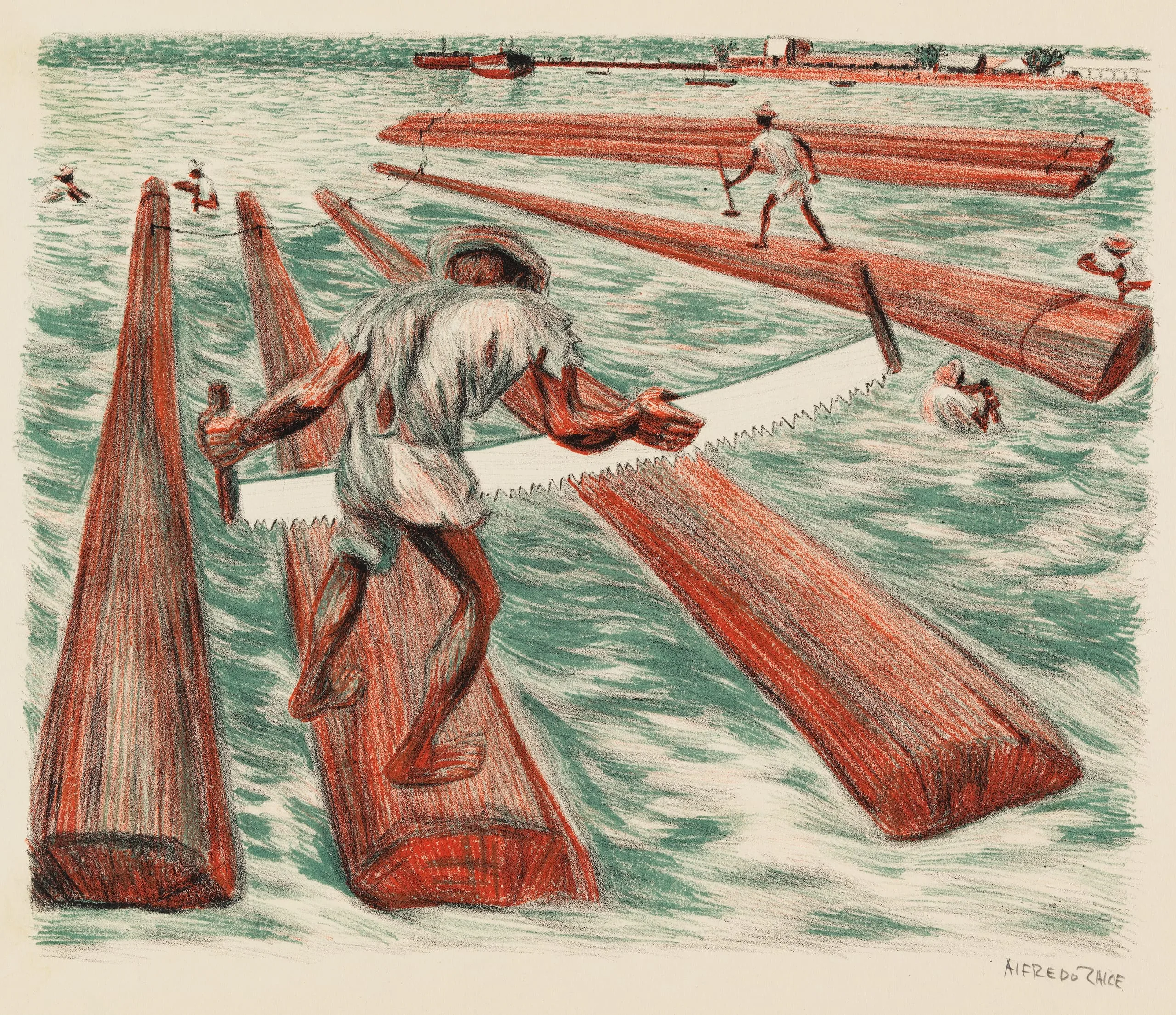 From the outset, TGP members centered images of rural laborers to push for agrarian reform. Here, Alfredo Zalce portrays Indigenous lumber workers in the southeastern state of Campeche sawing mahogany logs. The striking similarities between the central figure’s legs and the log on which he stands visually link the laborer, his task, and raw material. Zalce created this lithograph for the portfolio Mexican People, which was published in the United States in 1946; he therefore had a foreign collector’s eye in mind.