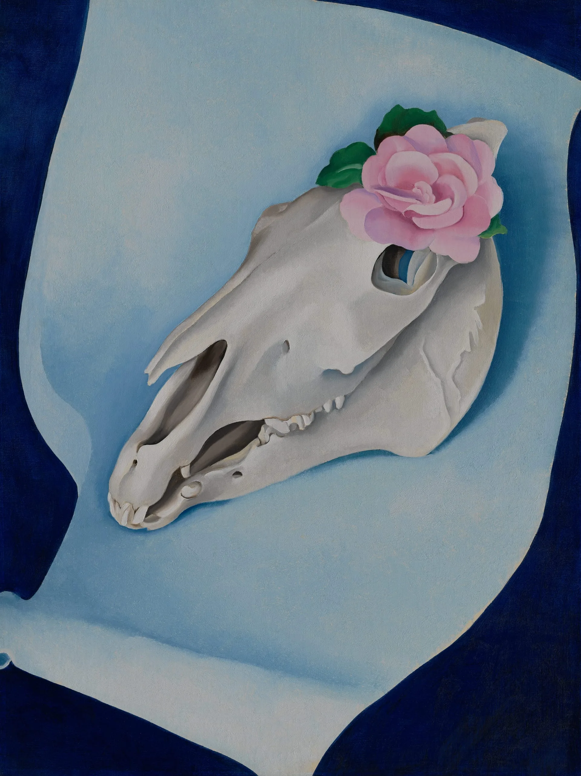 After spending the summer of 1929 in New Mexico, Georgia O’Keeffe began to incorporate desert motifs into her earlier flower subjects. In this modern vanitas painting (Renaissance still life, where skulls symbolize the "vanity" of earthly pursuits), she juxtaposes a sun-bleached horse’s skull with a rose to evoke death and the fleeting nature of beauty and being.