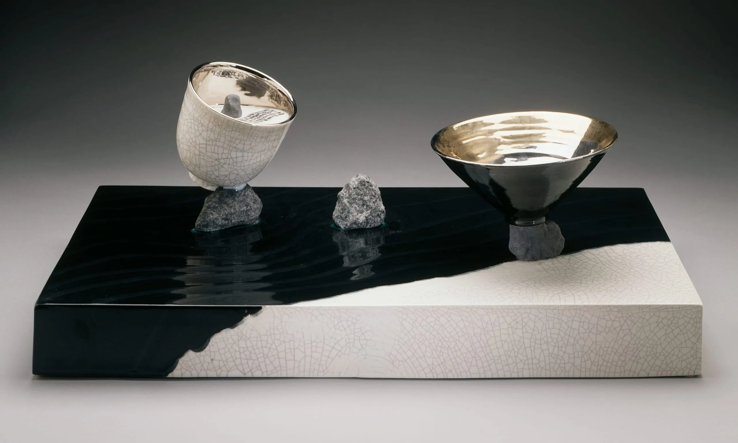 - a) White cup: 6 x 4 1/4 in. (15.24 x 10.8 cm); b) small rock: 2 x 2 x 1 38 in. (5.08 x 5.08 x 3.49 cm); c) gold cup: 3 3/4 x 6 3/4 in. (9.53 x 17.15 cm); d) base :2 3/8 x 22 3/8 x 12 1/2 in. (6.03 x 56.83 x 31.75 cm)
