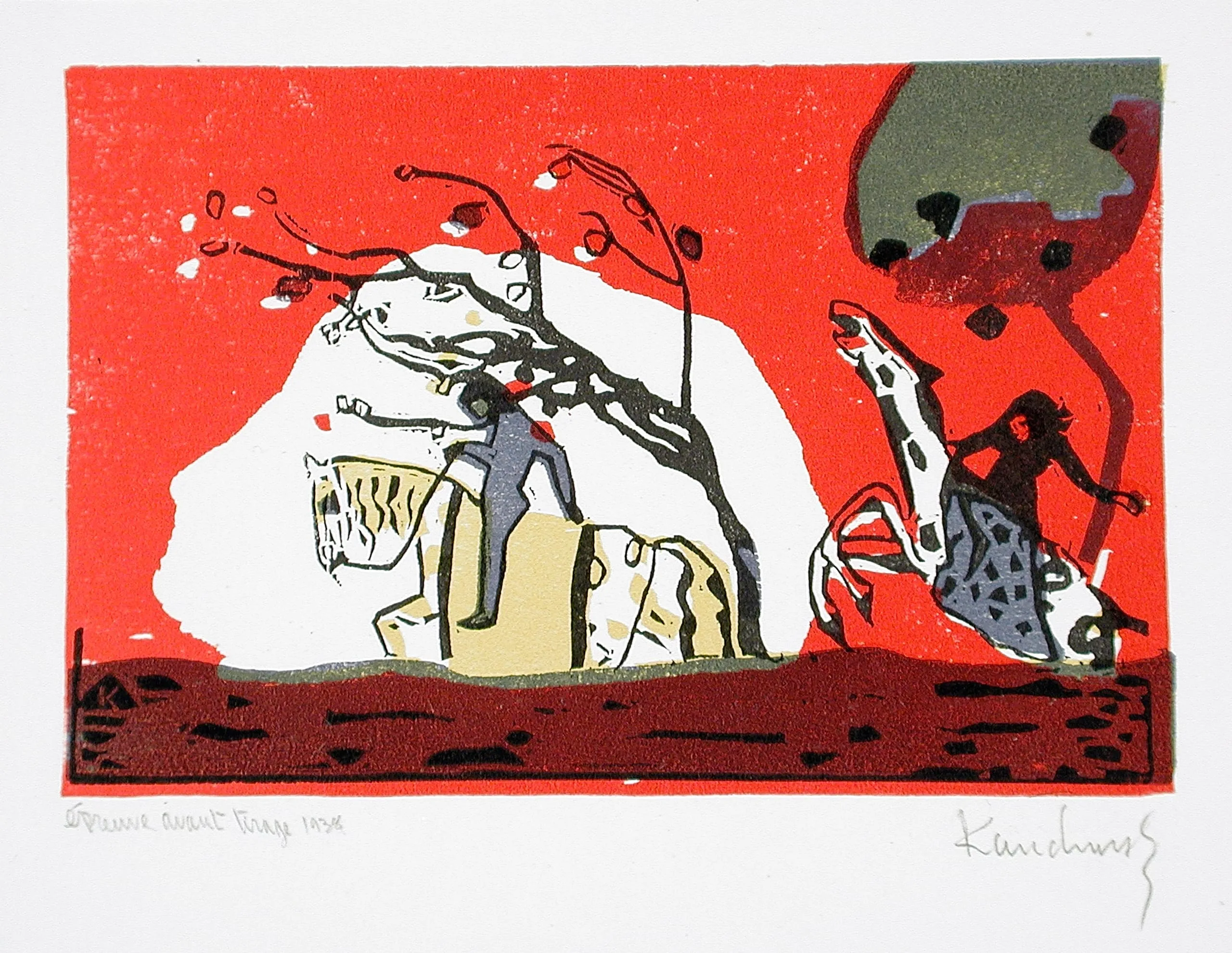 - Woodcut printed in yellow, red, blue and black on Van Gelder paper