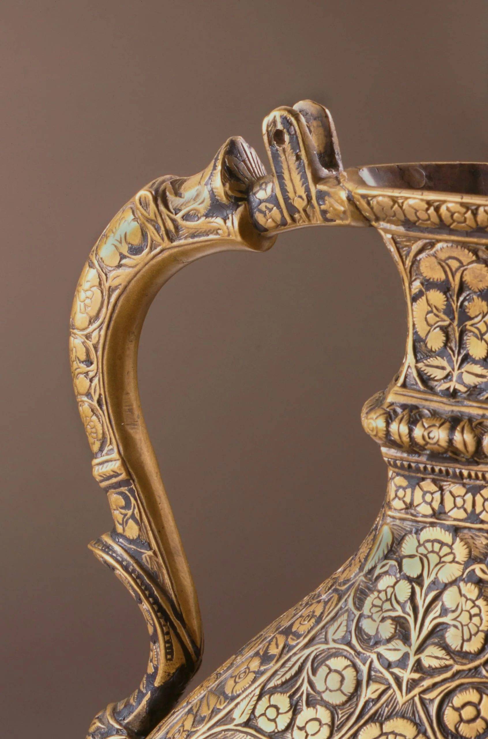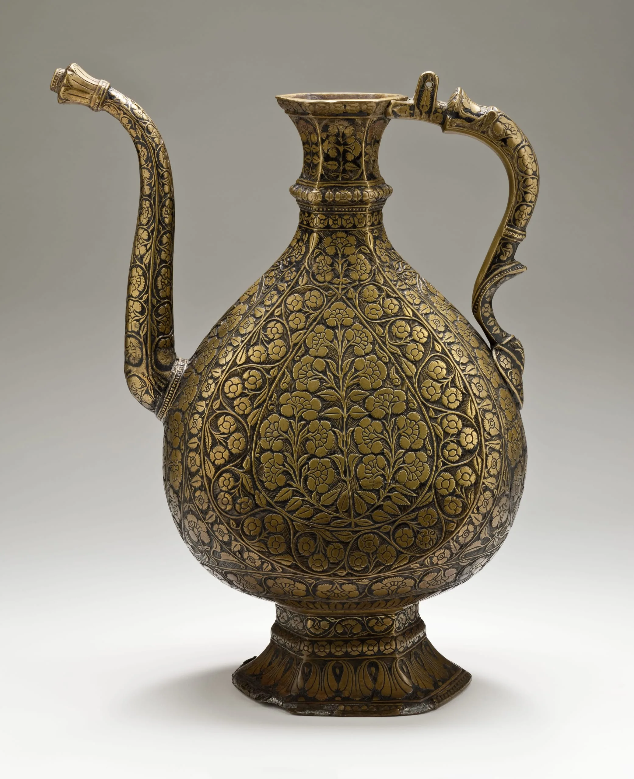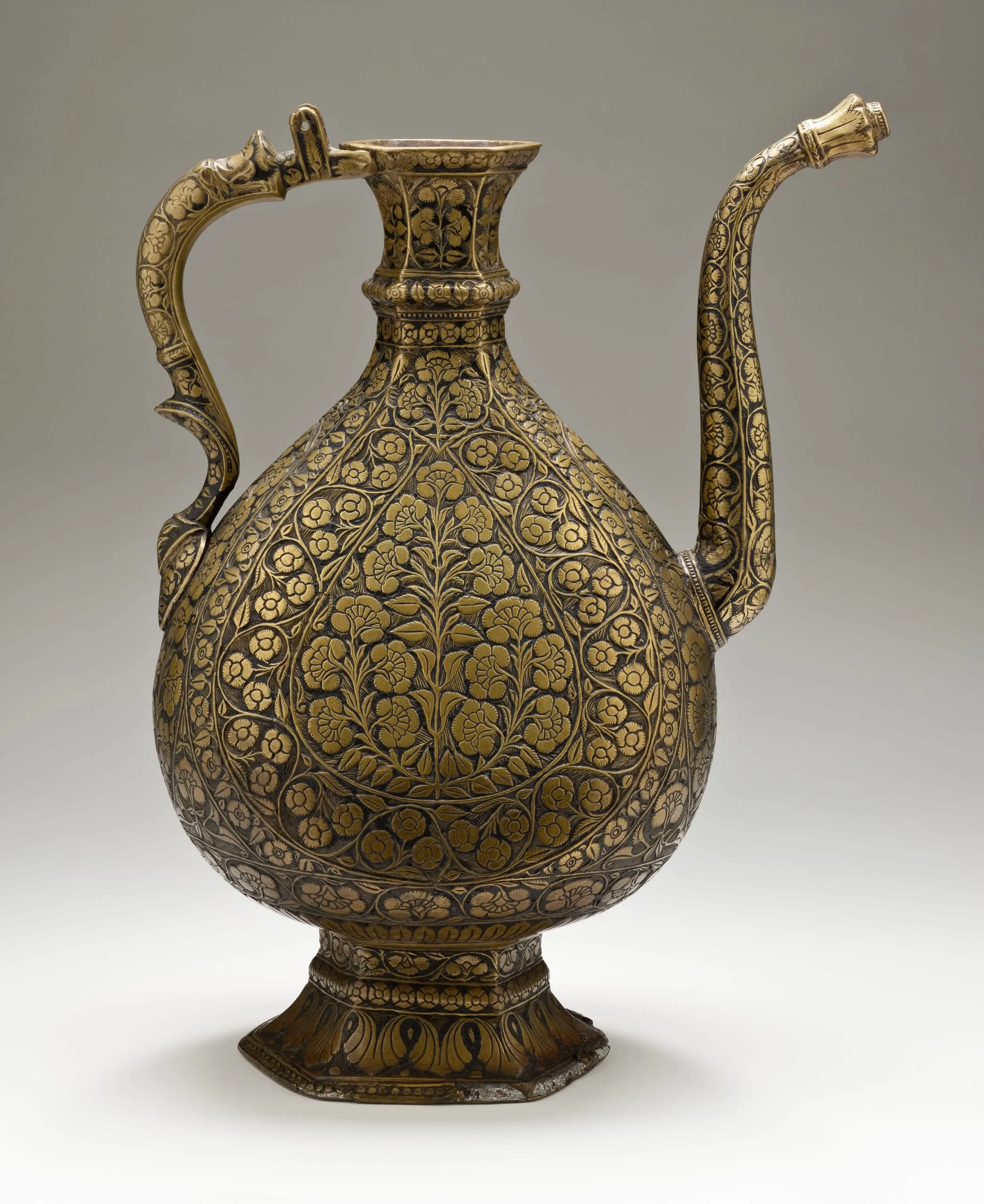 Water ewers are among the primary material objects in Islamic art and culture. Ewers and their matching basins are used principally for the washing of hands during the traditional cultural practice of ceremonial and mundane ablutions. The earliest Islamic water ewers date from the advent of the religion in the 7th century. By the Mughal era (1526–1858), water ewers were produced throughout the Islamic world, and in China as export ware, in a variety of media and vessel forms. Water ewers were also manufactured in South Asia for ritual use and cleansing by Hindus and Sikhs. Fashioned in Lahore, which was the northern capital of the Mughal dynasty in the 16th through mid-19th century, the ewer epitomizes the fine brassware created in the Panjab, the border region shared today by Pakistan and India.