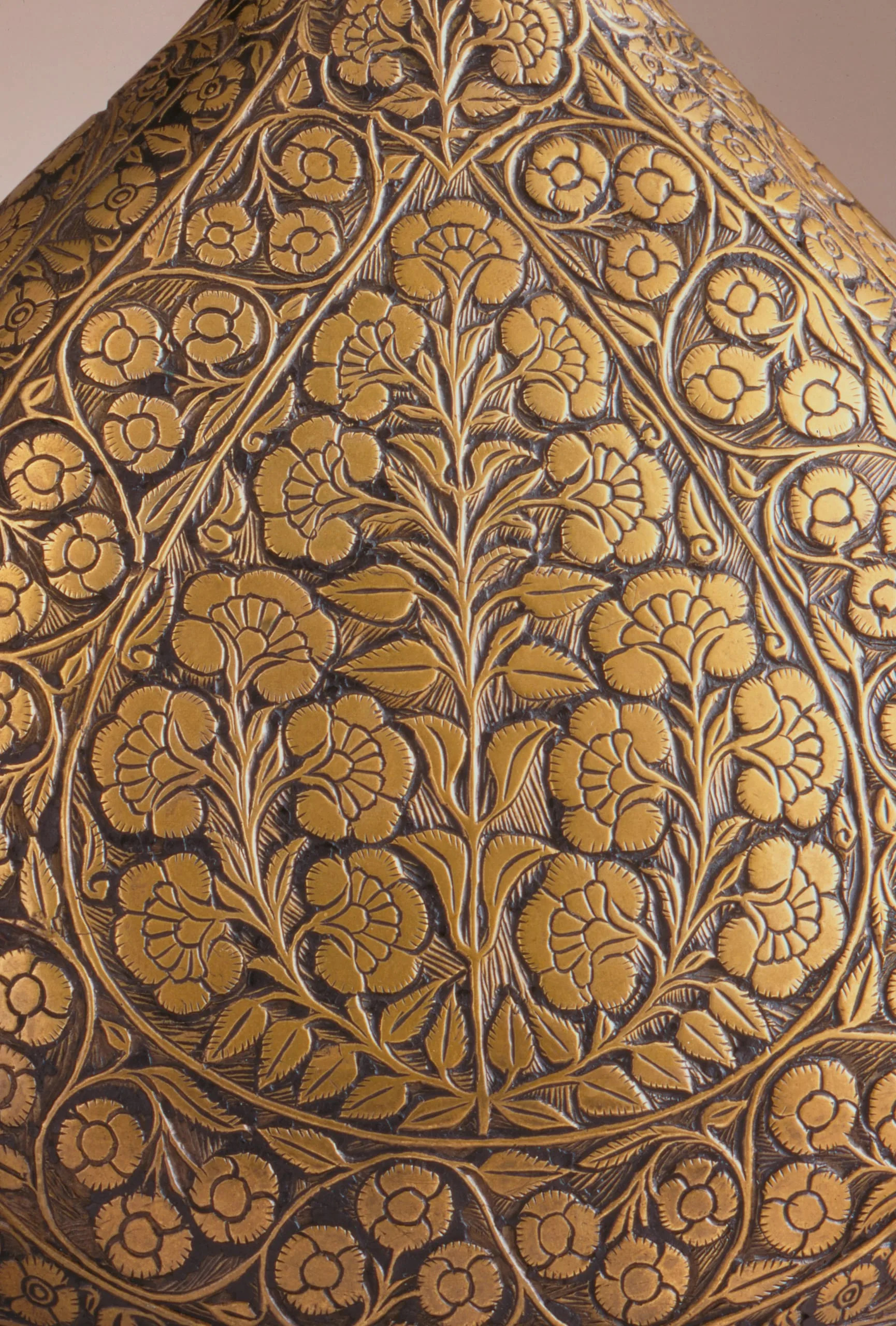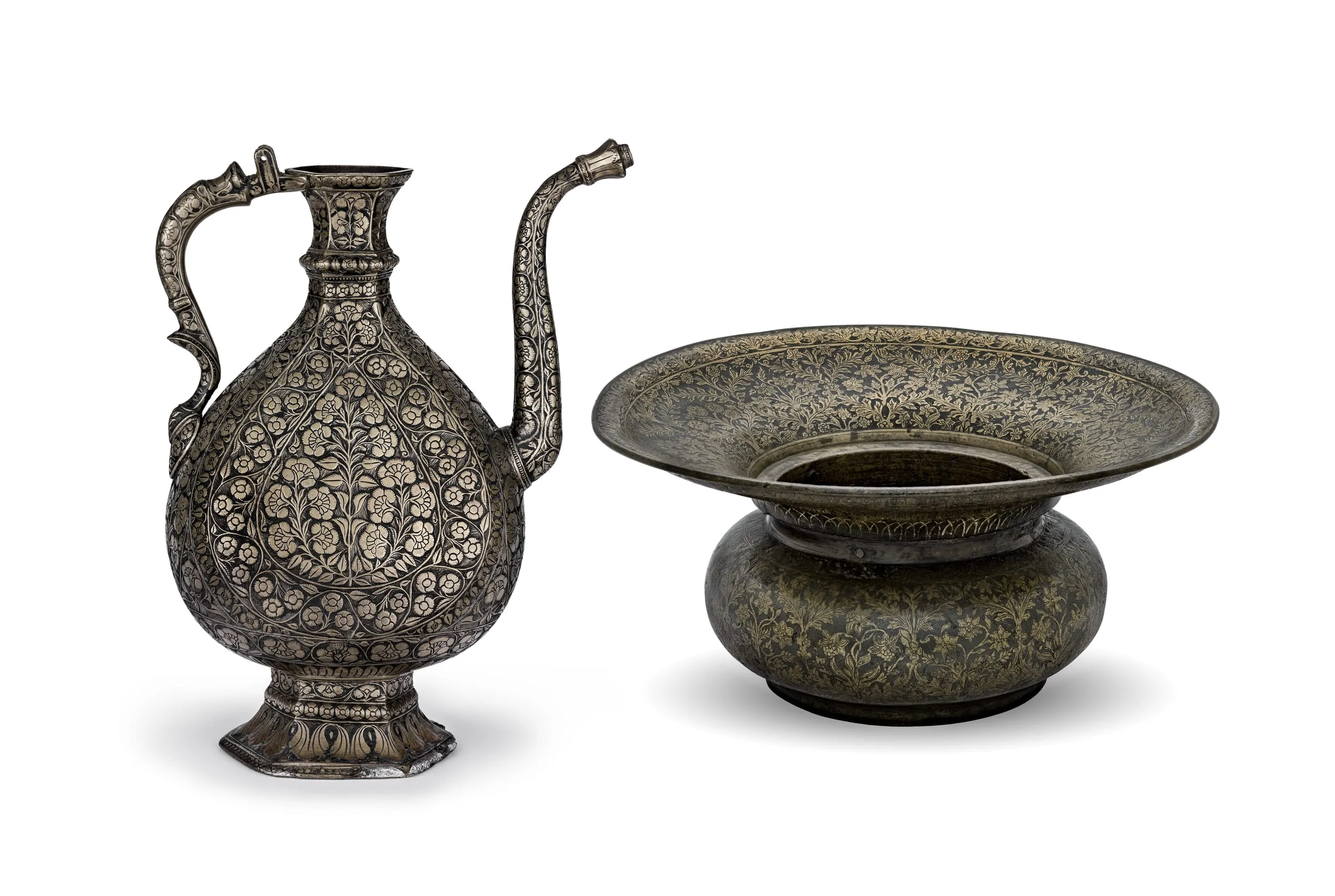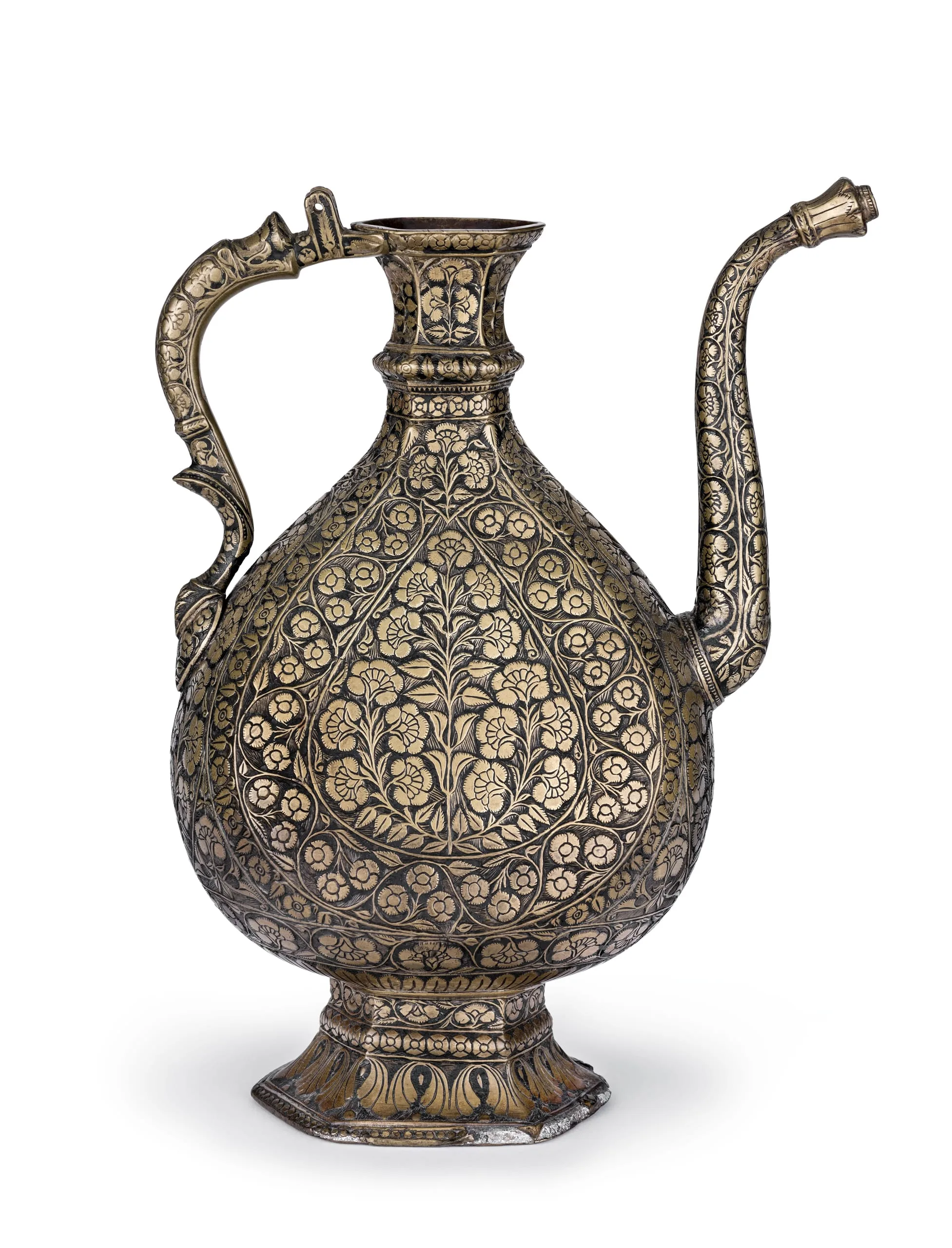 Water ewers are among the primary material objects in Islamic art and culture. Ewers and their matching basins are used principally for the washing of hands during the traditional cultural practice of ceremonial and mundane ablutions. The earliest Islamic water ewers date from the advent of the religion in the 7th century. By the Mughal era (1526–1858), water ewers were produced throughout the Islamic world, and in China as export ware, in a variety of media and vessel forms. Water ewers were also manufactured in South Asia for ritual use and cleansing by Hindus and Sikhs. Fashioned in Lahore, which was the northern capital of the Mughal dynasty in the 16th through mid-19th century, the ewer epitomizes the fine brassware created in the Panjab, the border region shared today by Pakistan and India.