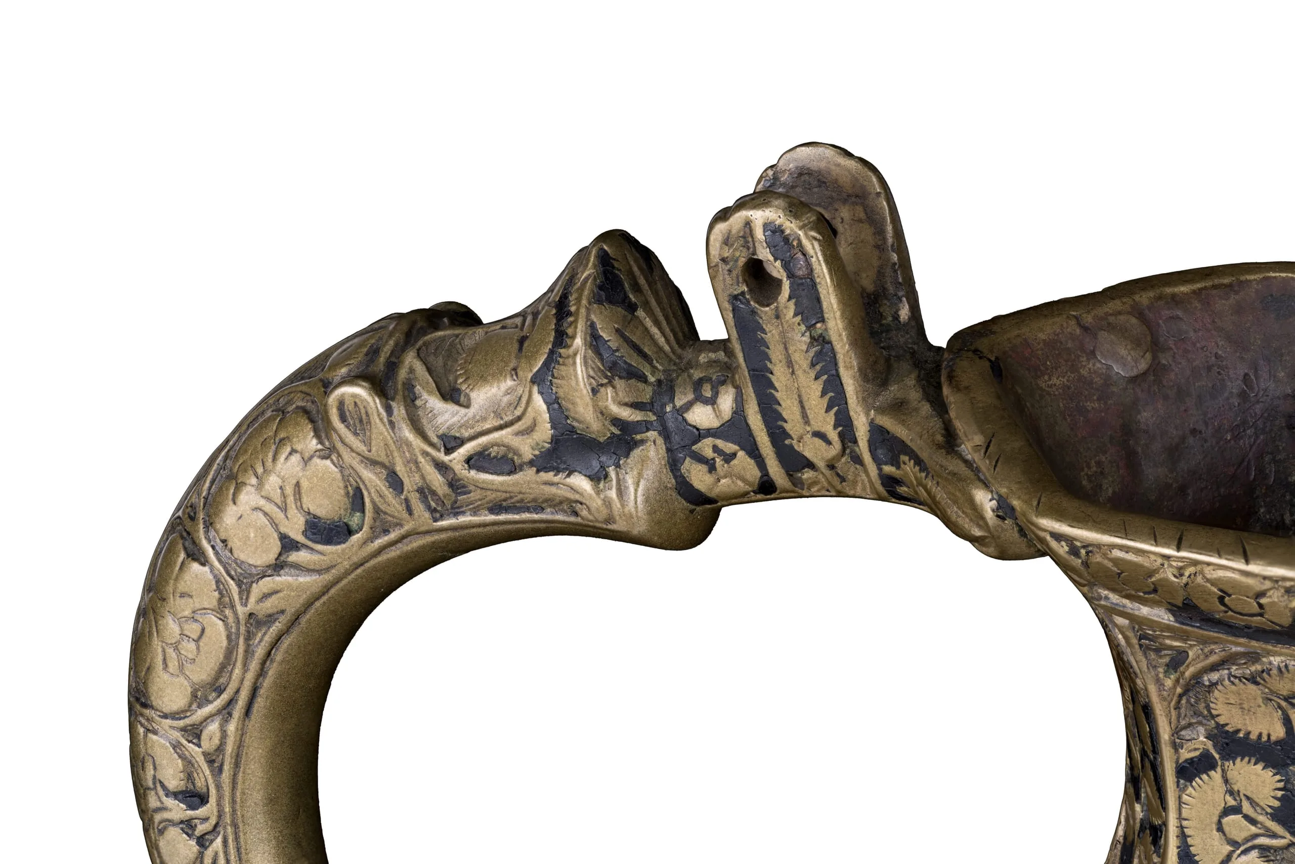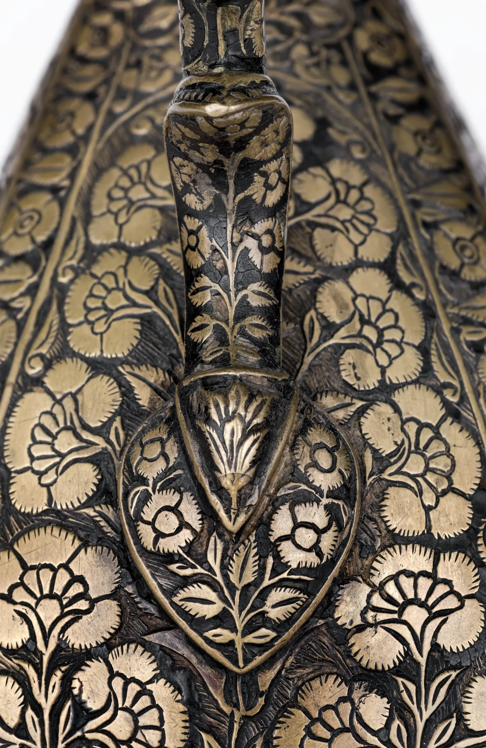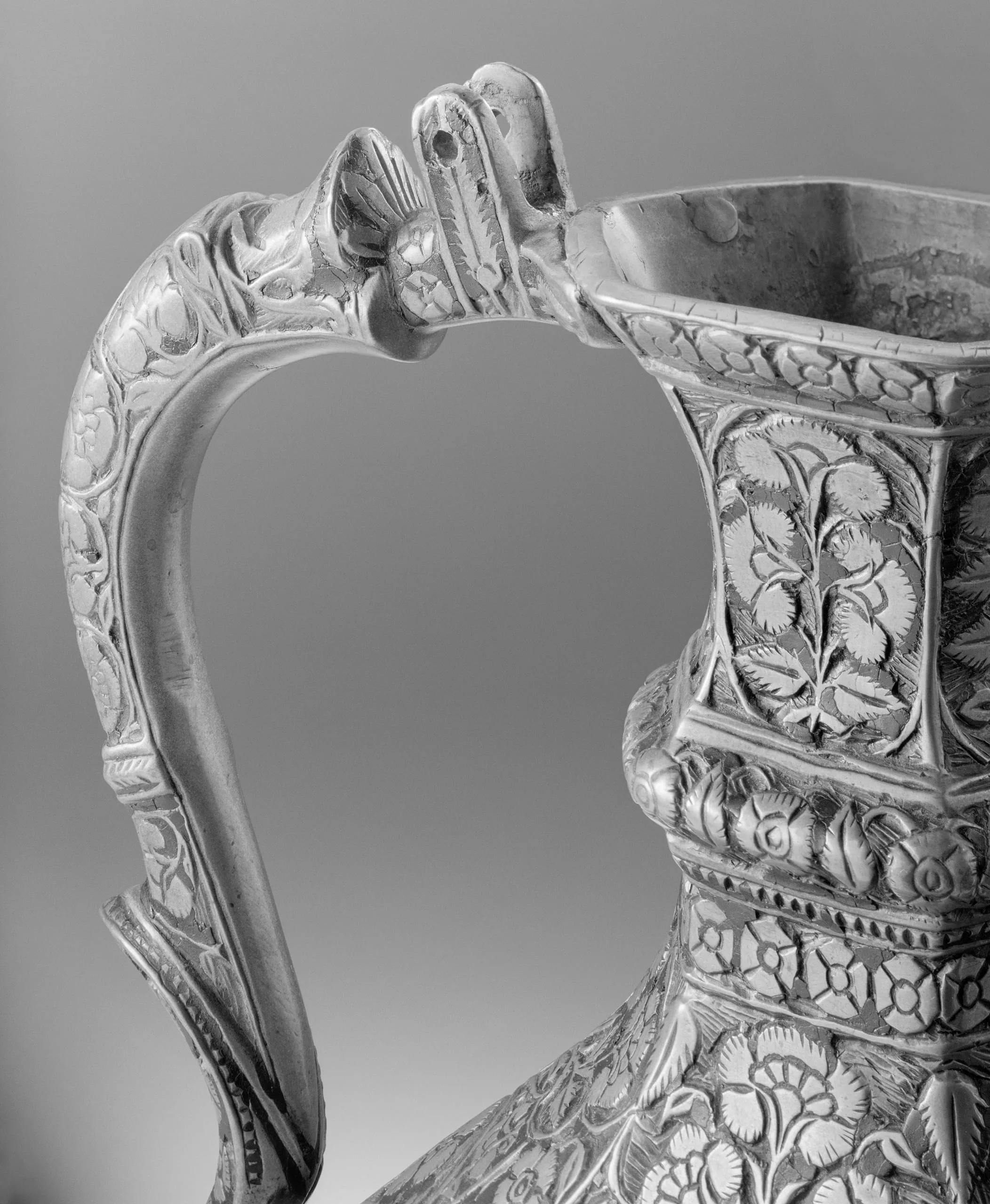 The ewer has a pear-shaped body with chamfered sides supported by a flared hexagonal pedestal foot. The hexagonal neck has an everted rim and six arcade panels, with a band of ring molding at the junction to the body. A particularly intriguing design feature of the ewer is the "Mughalized" or "floralized" dragon head at the upper terminal of the handle adjacent to the hinge flanges for the now missing lid. This iconographic element is traditionally found on Middle Eastern Islamic water ewers, but it has been transformed on this Mughal masterpiece into a subtle floriated form, with flowers used for its bulging eyes, leaves for its pointed ears, and forking branches for its gaping mouth. The ewer’s cast and engraved decoration was once highlighted by a dark resin or lac ground (now mostly missing except for the handle); it consists principally of a stylized flowering plant, most likely a rose shrub in two central teardrop-shaped panels on the vessel’s sides. Two concentric borders of floral scrolls surround the central panels.