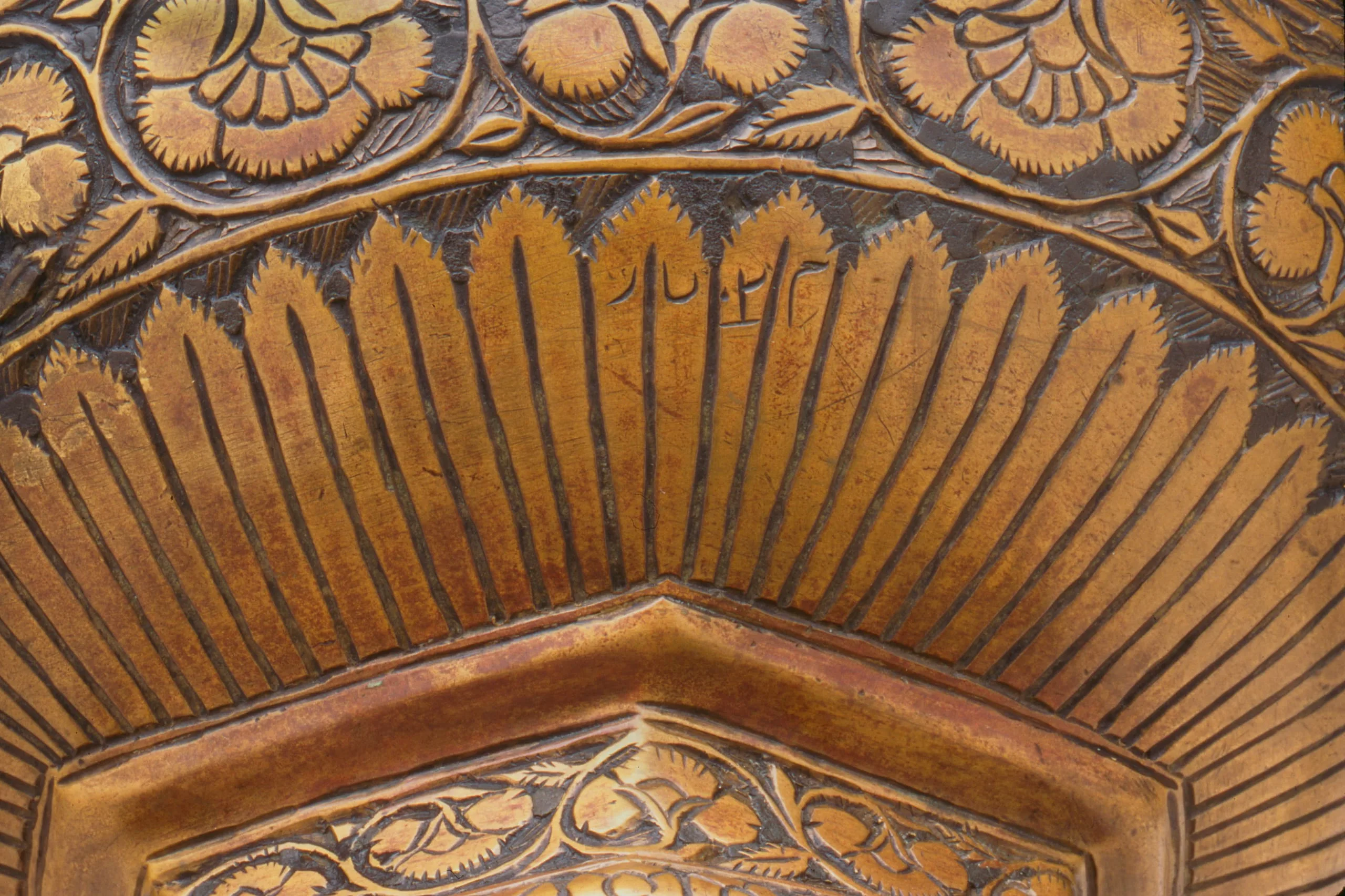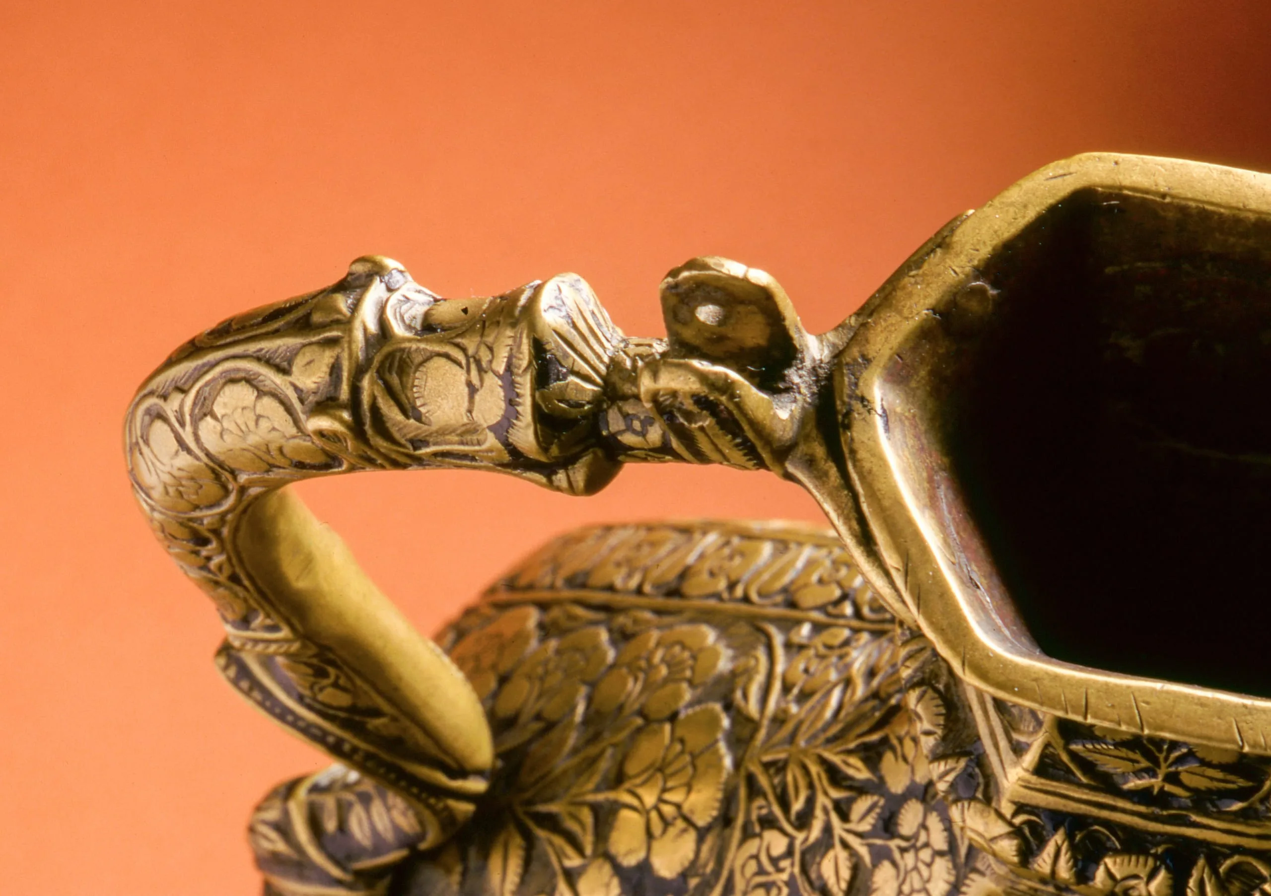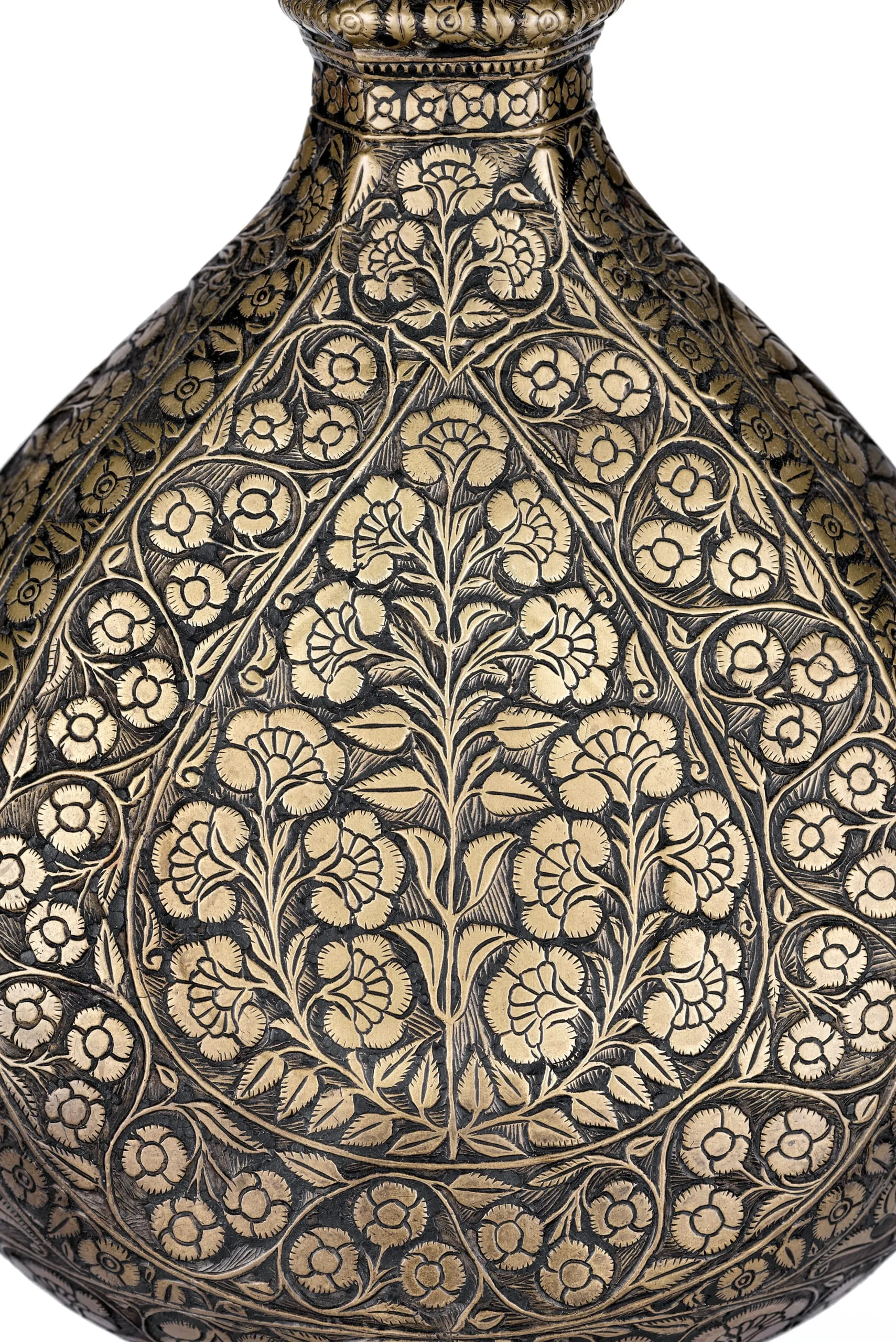 The ewer has a pear-shaped body with chamfered sides supported by a flared hexagonal pedestal foot. The hexagonal neck has an everted rim and six arcade panels, with a band of ring molding at the junction to the body. A particularly intriguing design feature of the ewer is the "Mughalized" or "floralized" dragon head at the upper terminal of the handle adjacent to the hinge flanges for the now missing lid. This iconographic element is traditionally found on Middle Eastern Islamic water ewers, but it has been transformed on this Mughal masterpiece into a subtle floriated form, with flowers used for its bulging eyes, leaves for its pointed ears, and forking branches for its gaping mouth. The ewer’s cast and engraved decoration was once highlighted by a dark resin or lac ground (now mostly missing except for the handle); it consists principally of a stylized flowering plant, most likely a rose shrub in two central teardrop-shaped panels on the vessel’s sides. Two concentric borders of floral scrolls surround the central panels.