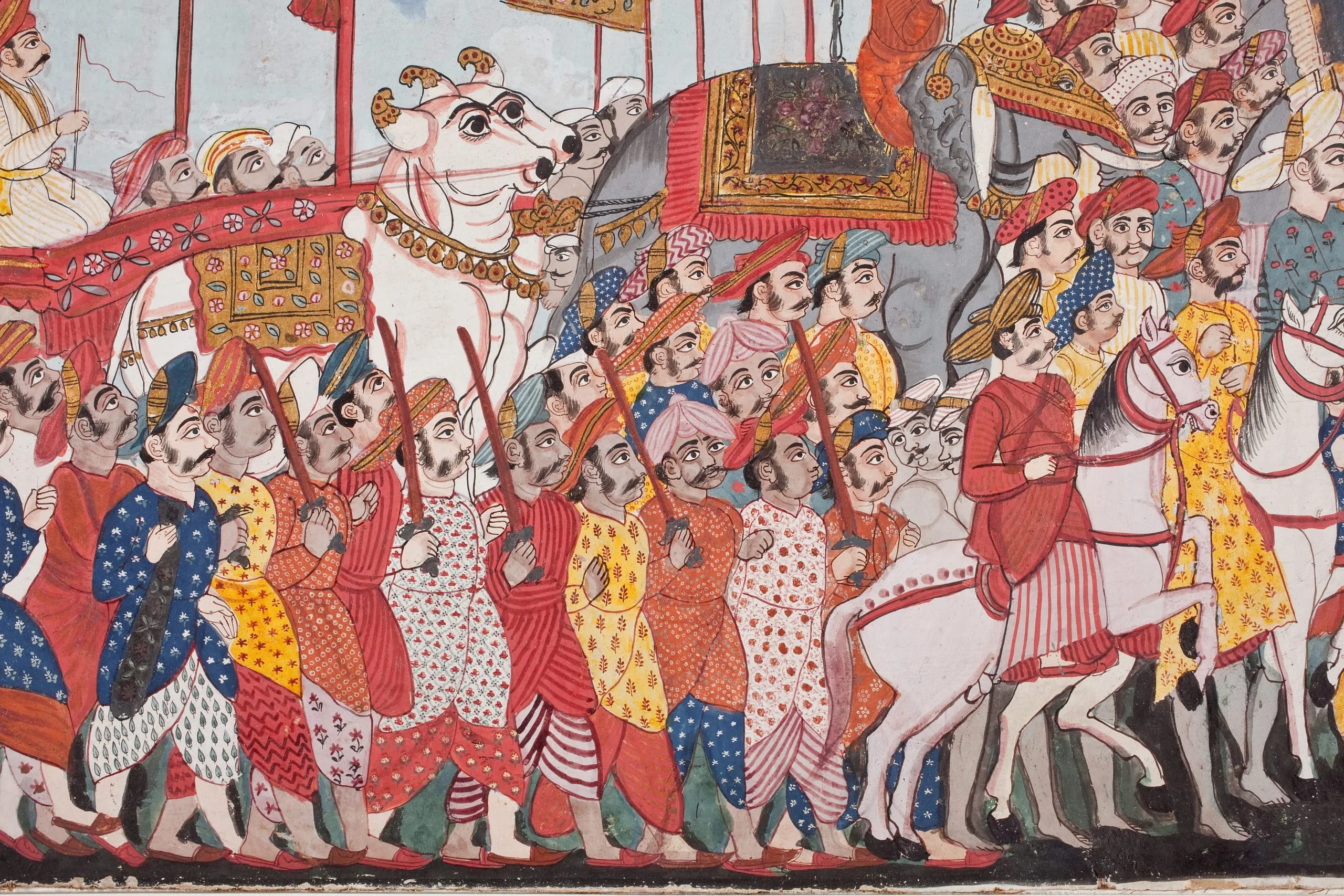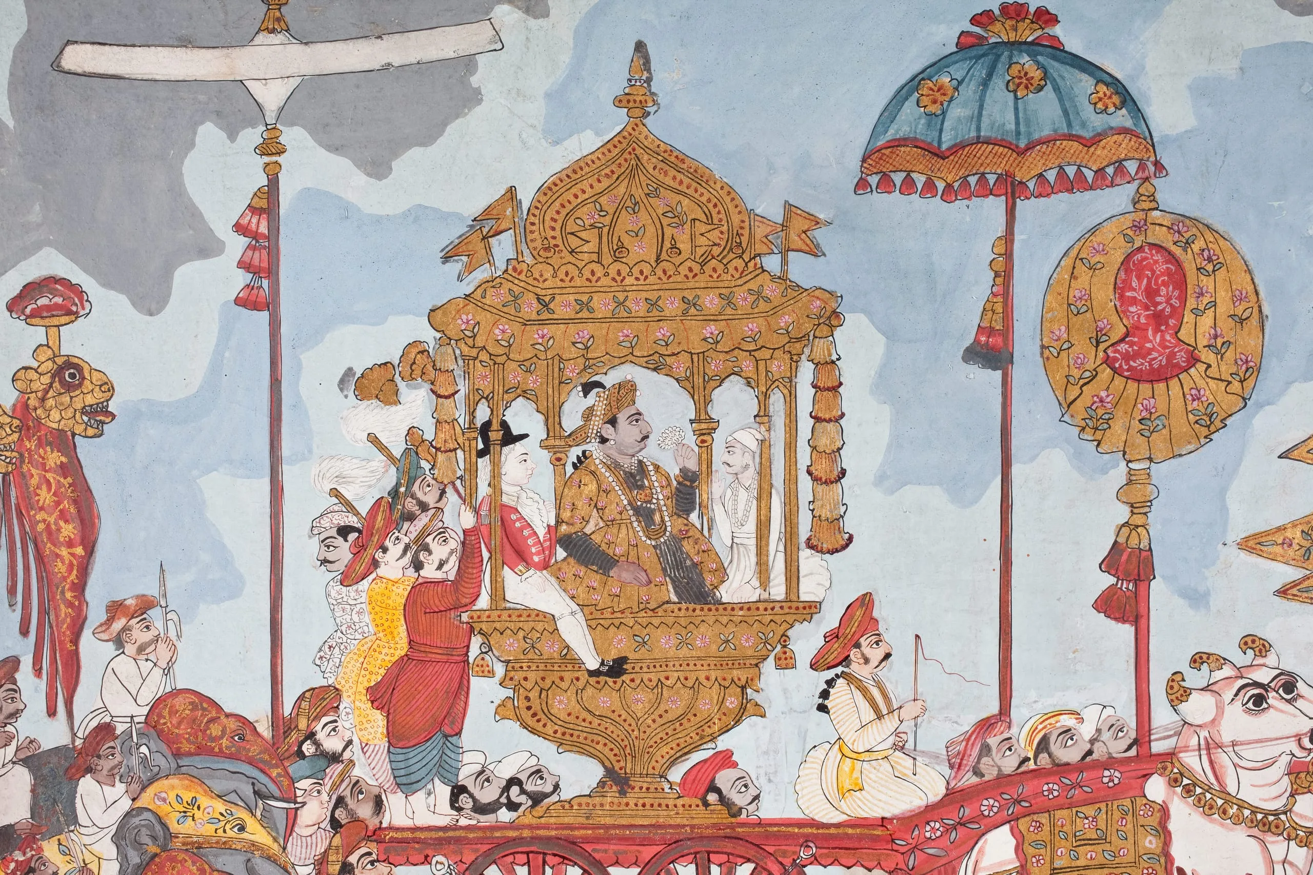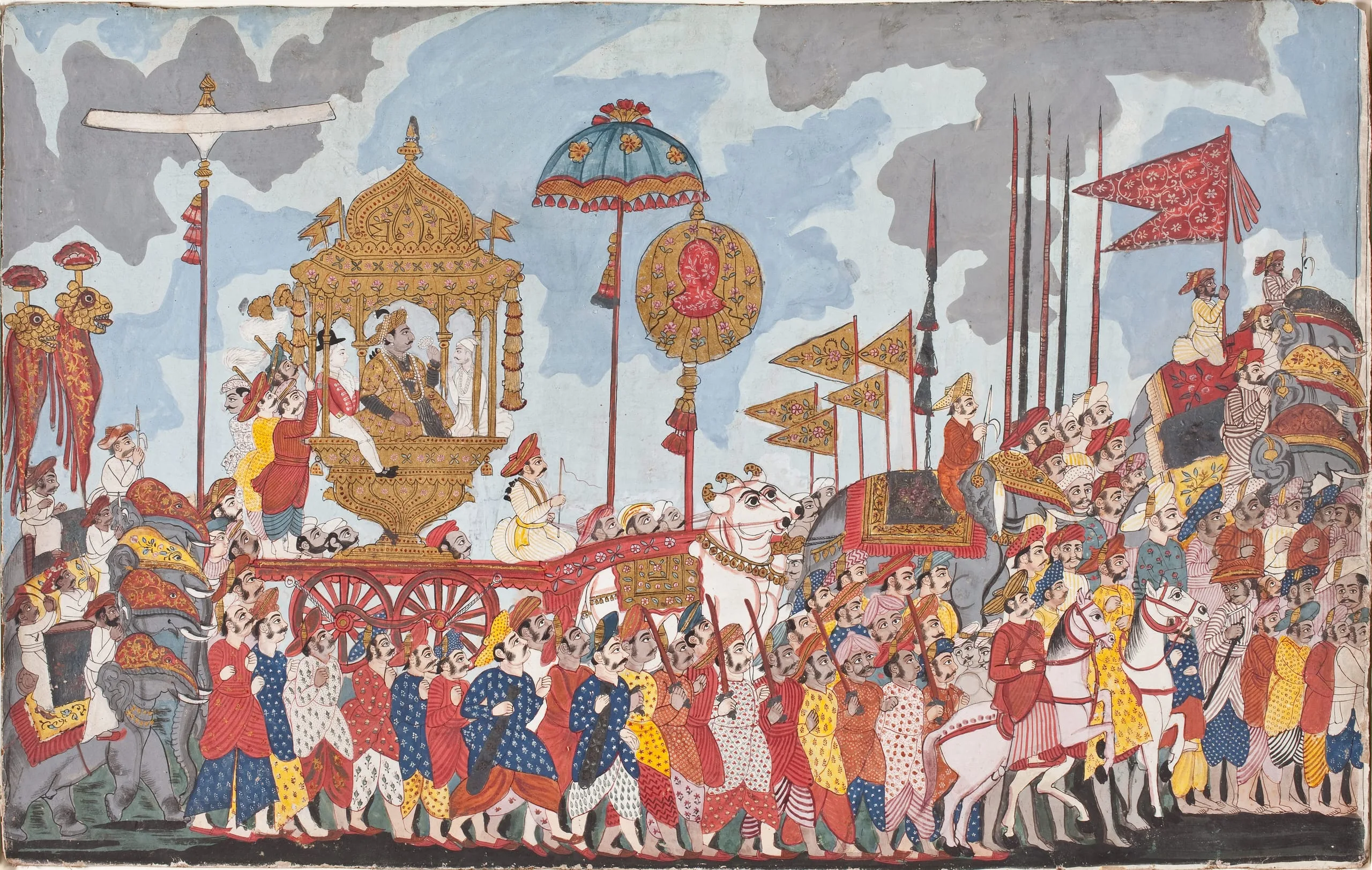 Grand ceremonial processions were a fashionable expression of royal pomp in Thanjavur, especially during the Dussehra festival in the month of Ashvin (September/October). Comparable processional scenes are in the Victoria and Albert Museum, London (IM.319-1921 and IM.10-1938) and the British Library, London (Add.Or.2594).