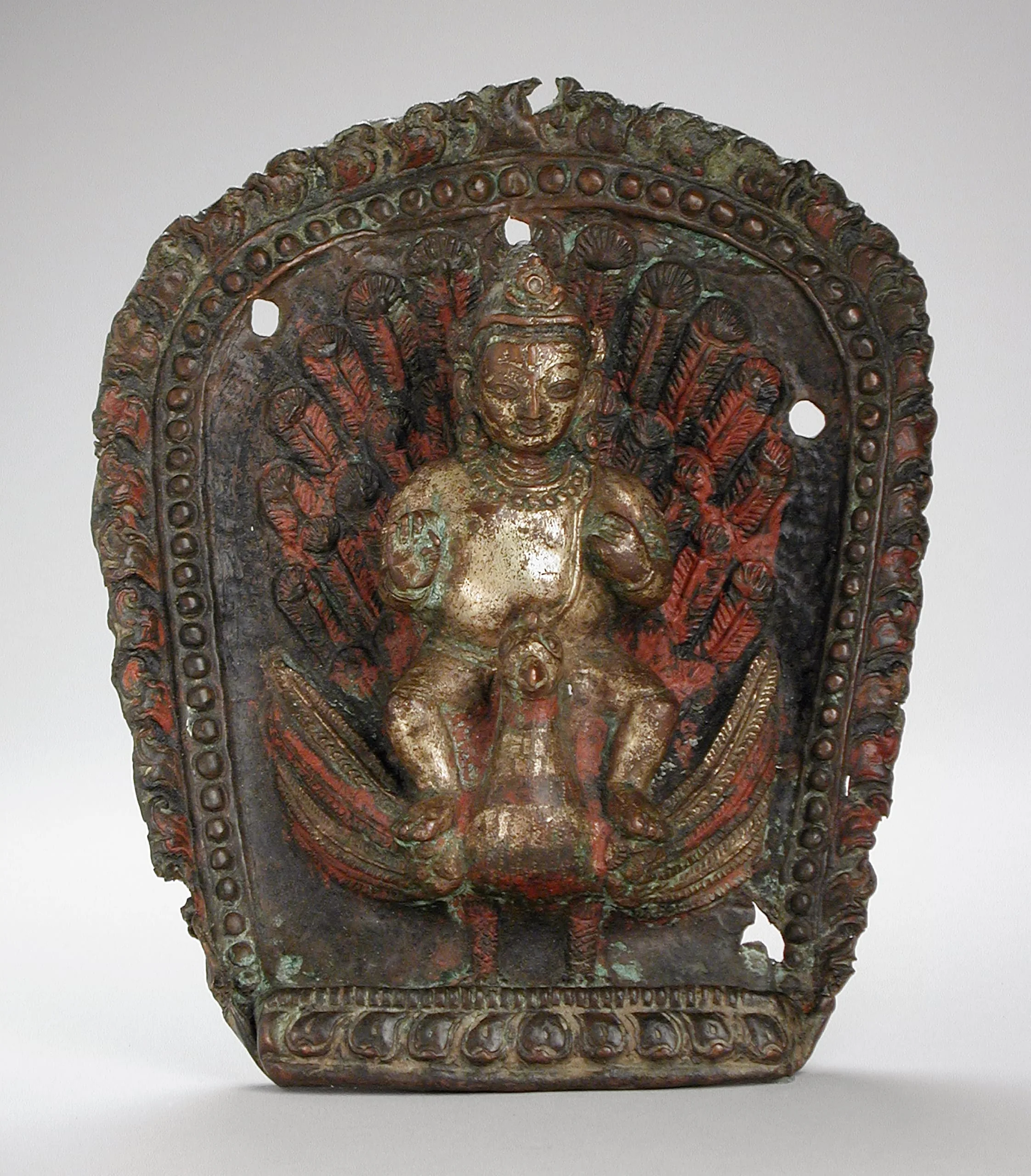 - Repoussé copper with traces of gilding and paint