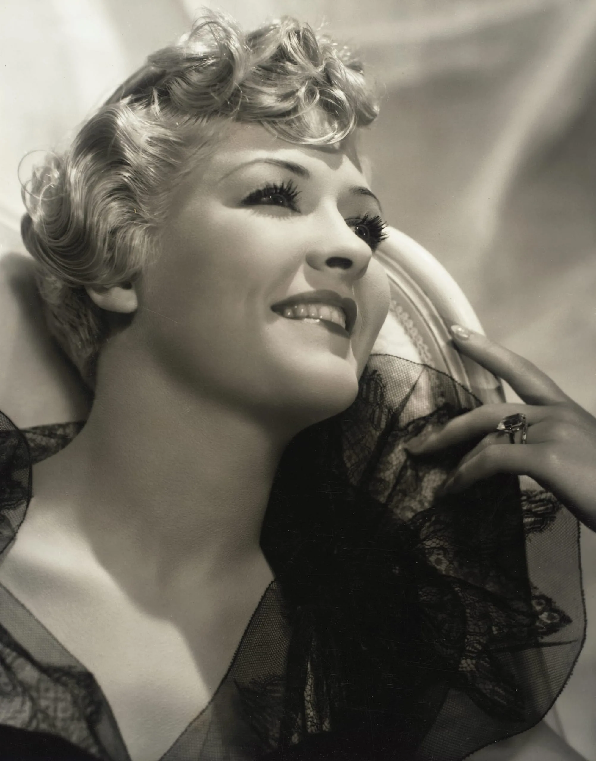 Black and white studio portrait photograph, woman with curled blonde hair and dramatic lashes looking upward, wearing ruffled black lace, softly lit from the left