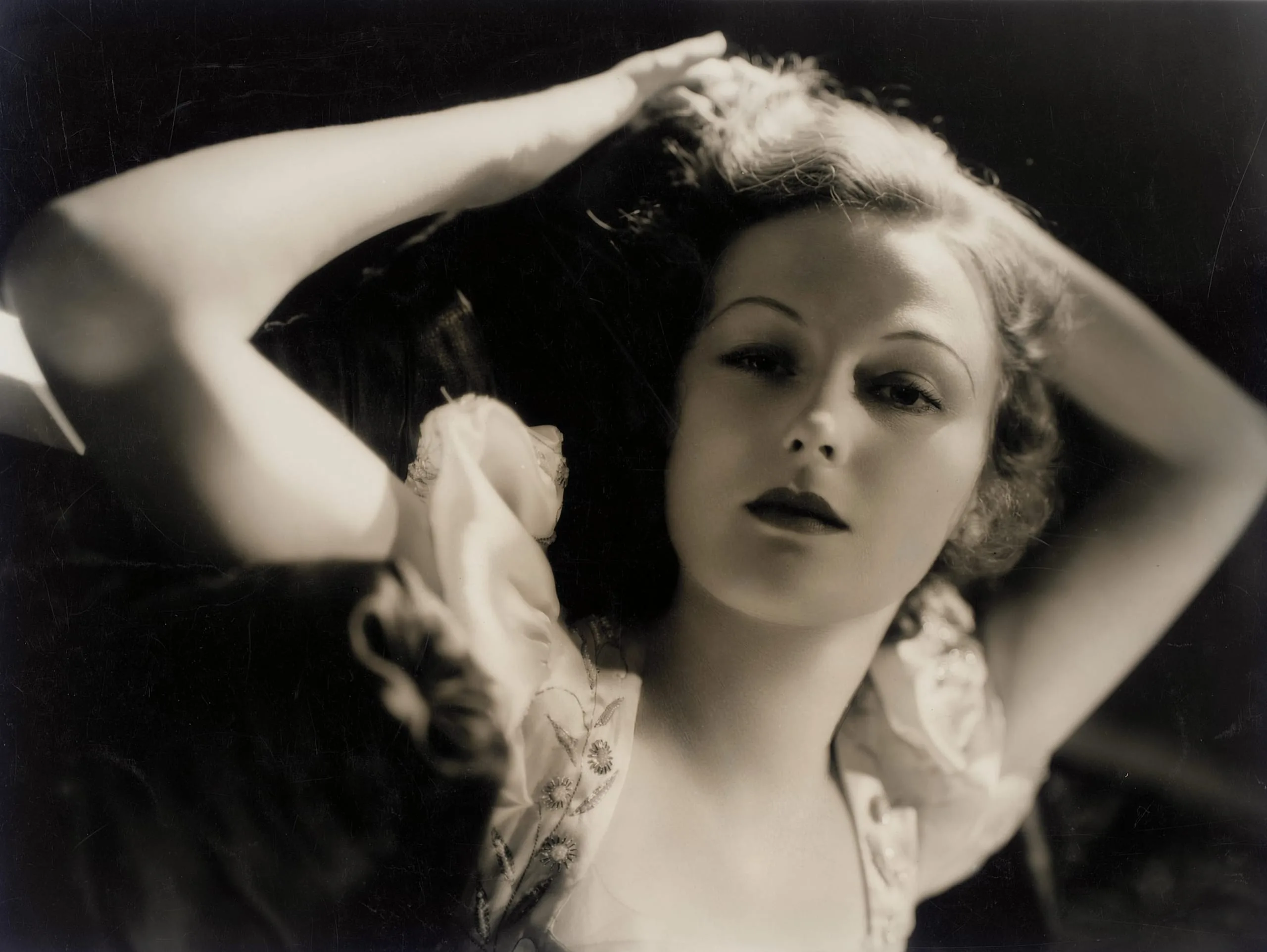 Sepia-toned portrait photograph, woman reclined with both arms raised behind her head, strong directional lighting from upper right, floral-print garment