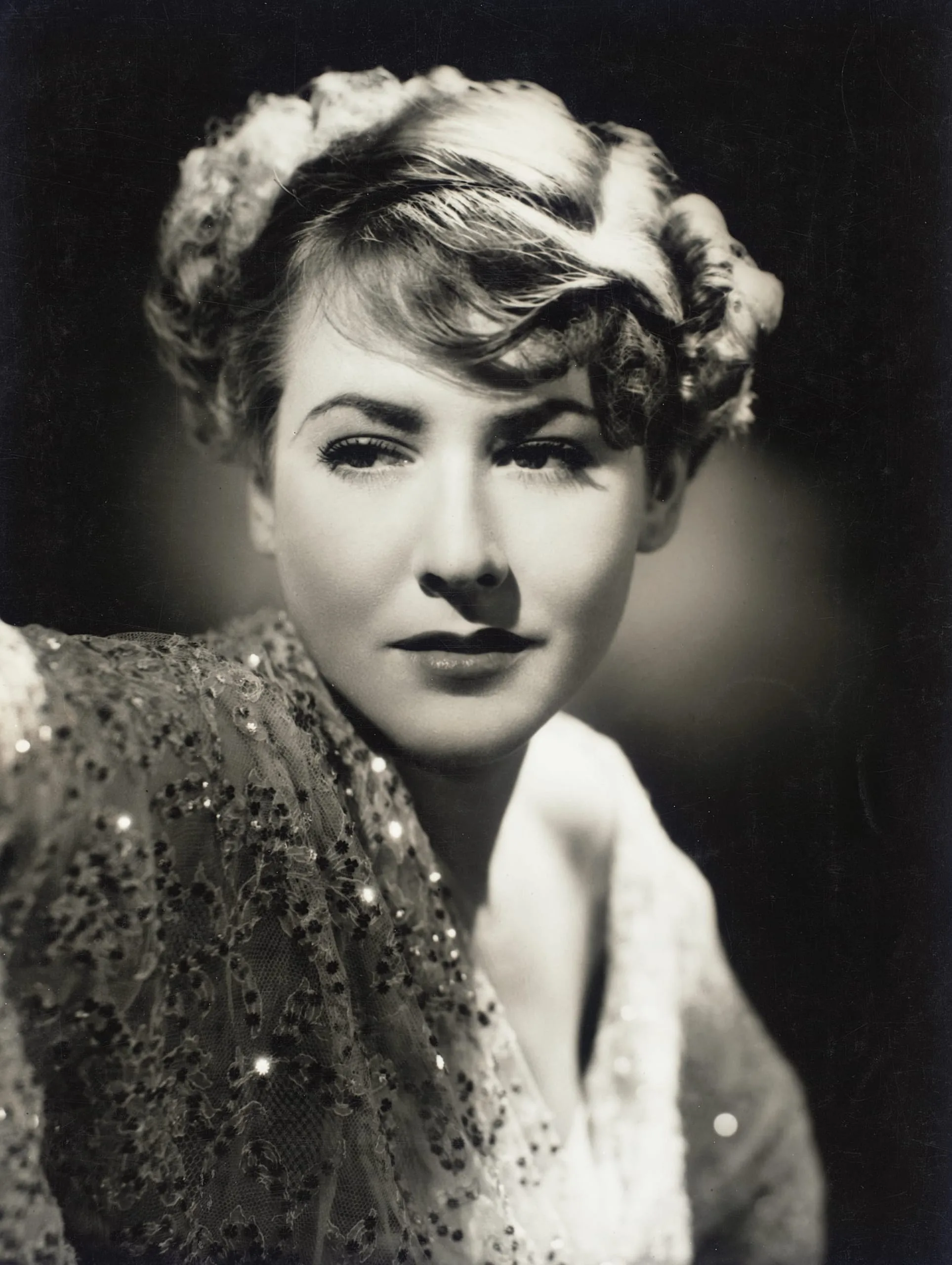 Warm-toned black and white portrait photograph, woman from the chest up with styled blonde waves, lace and fur garments, dramatically lit from the left