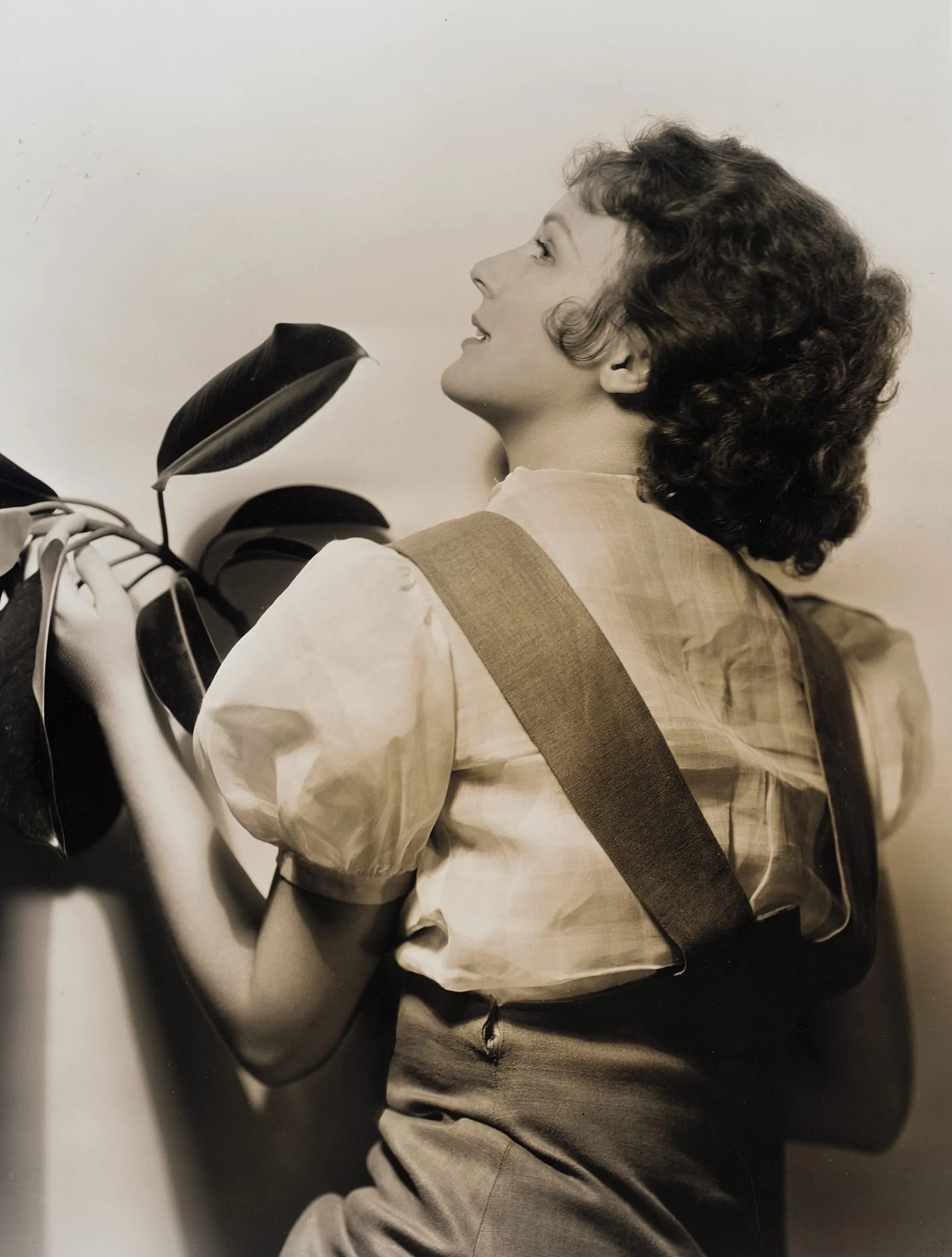 Sepia-toned portrait photograph, a woman seen from behind in profile, chin tilted upward, holding a dark hat against a pale wall, wearing a cream blouse and high-waisted trousers with a wide diagonal strap across her back