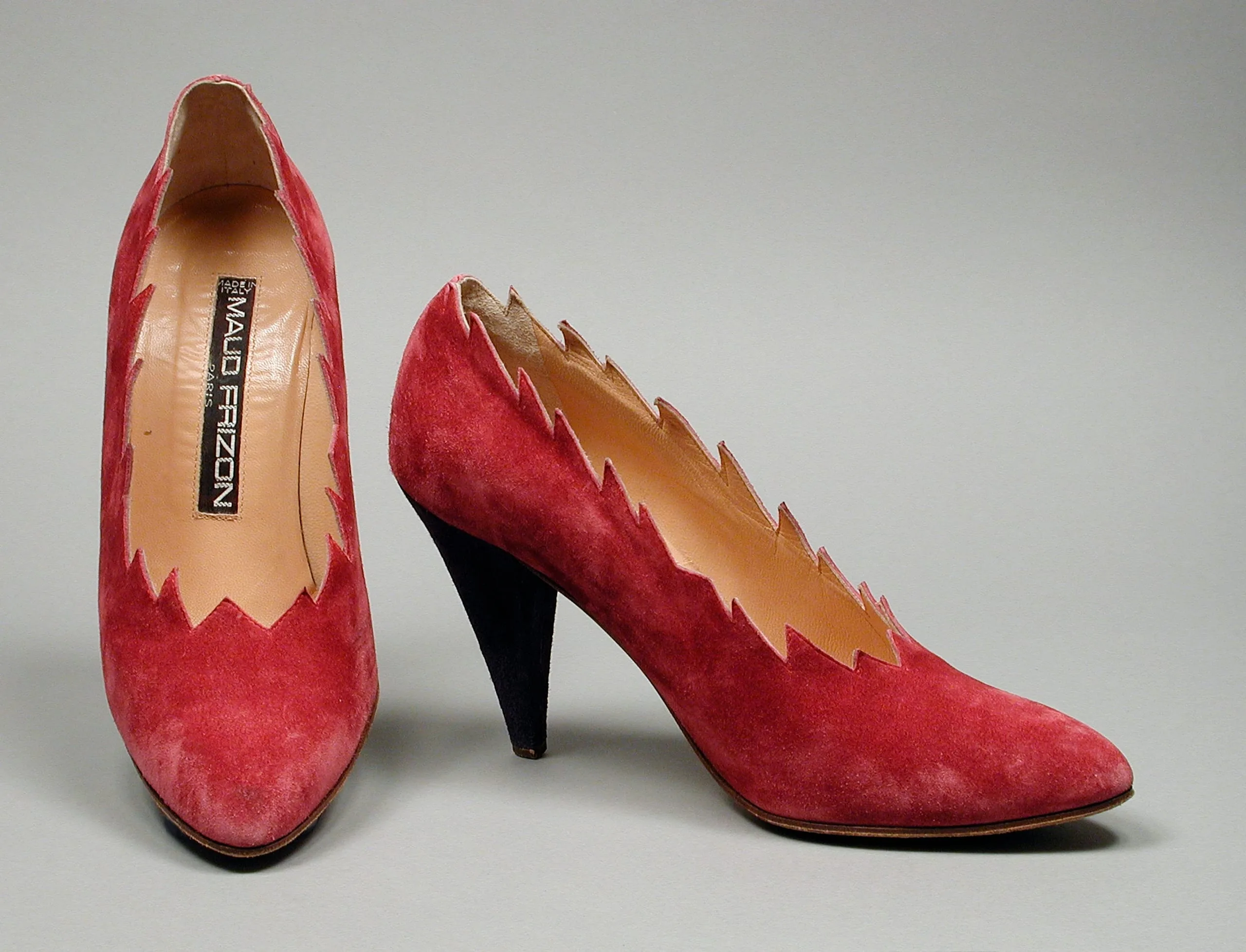 Pair of raspberry-red suede high-heeled pumps with jagged zigzag-cut edges, pointed toes, and black conical heels, displayed side by side