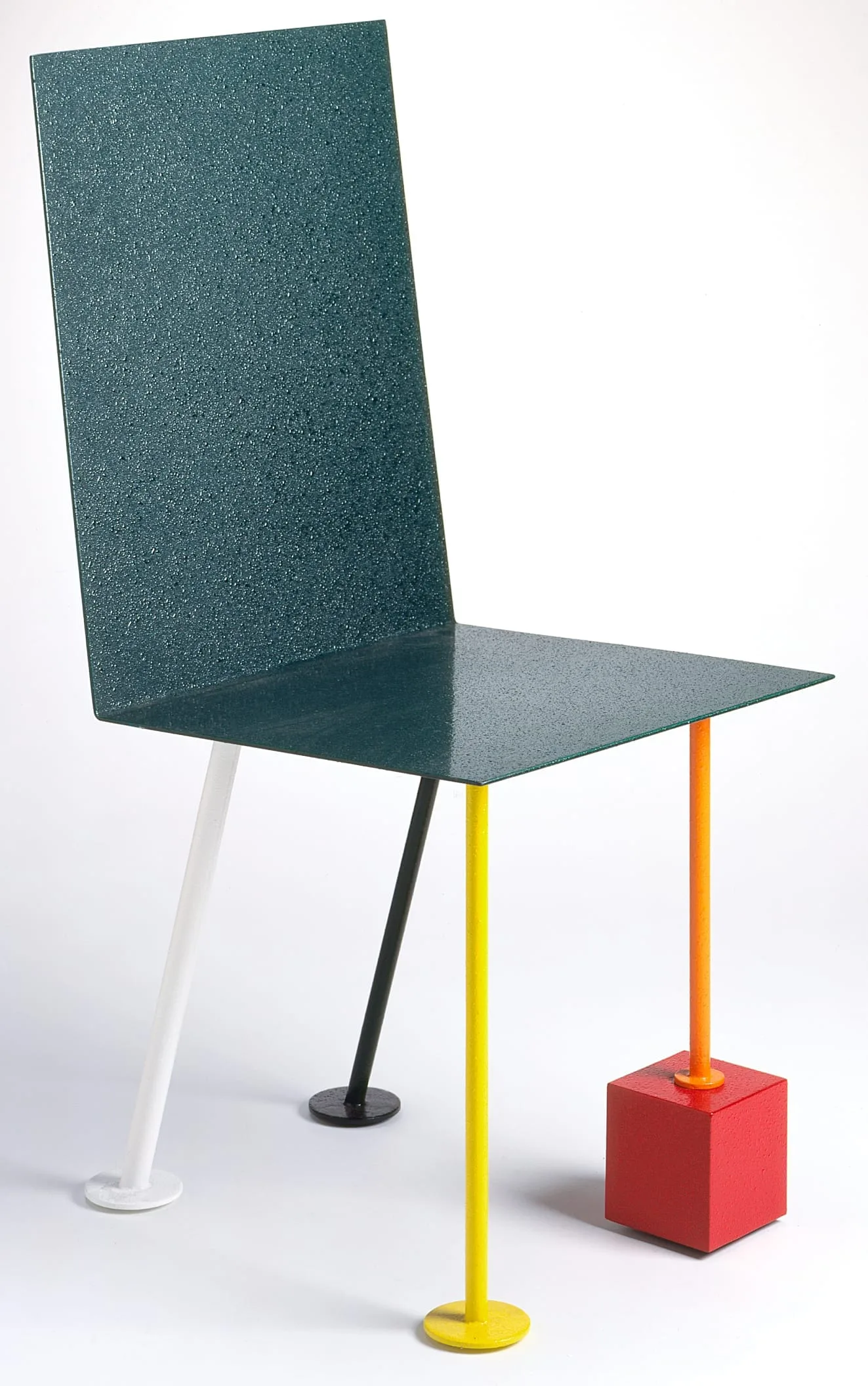 Postmodern chair with speckled teal seat and back panels supported by four mismatched legs in white, black, yellow, and red-and-yellow with a cubic red foot