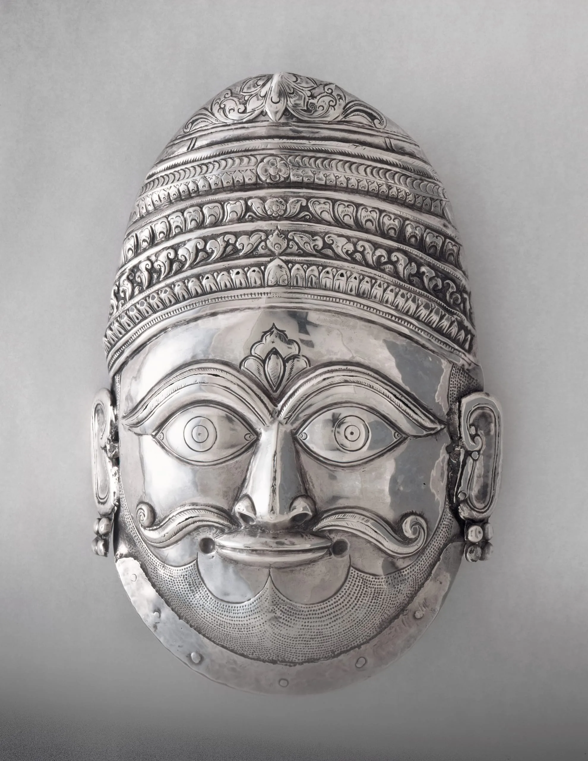 This mask of the Hindu god Shiva would have likely been used as an ornate visage for an image of the deity while in worship in a temple or domestic shrine (for comparison, see M.75.4.2), as a processional image (for comparison, see M.76.147.1), or as the divine face of Shiva gracing a Shivalinga (for comparison, see AC1995.220.1). A stylistically related silver mask of the goddess Devi is in the Sri Mangalamba Temple, Mangalore, Karnataka.