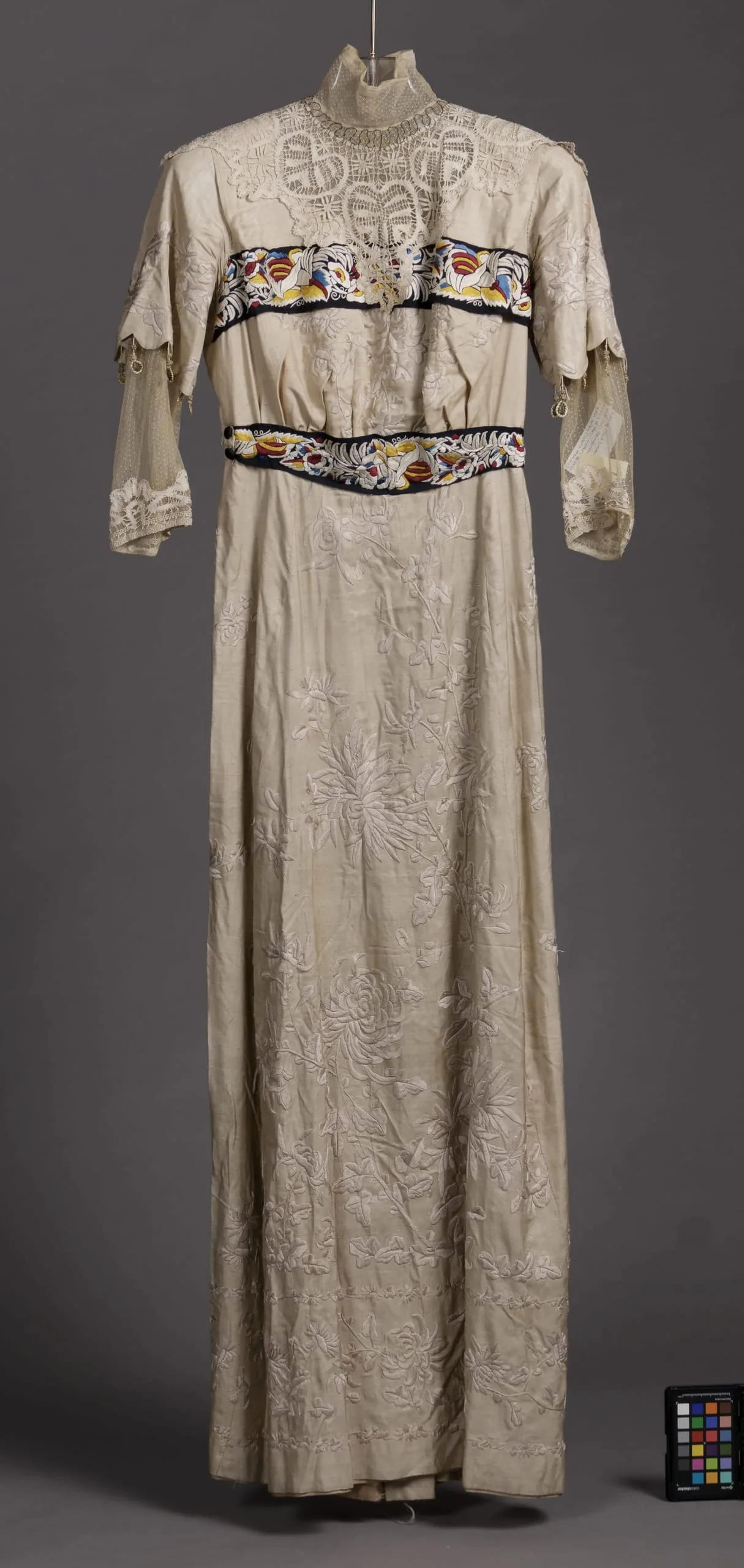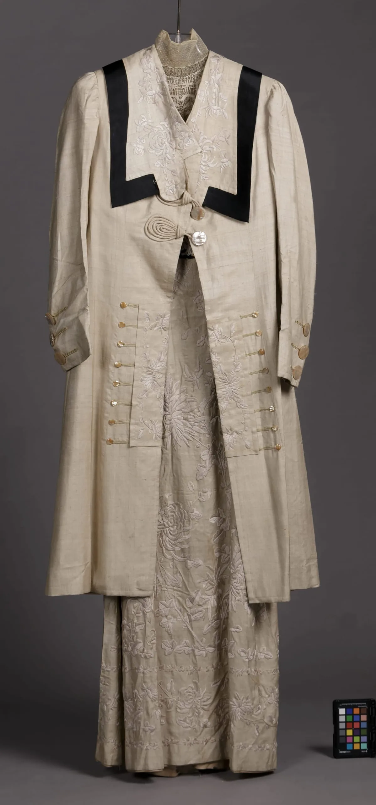 - Coat: Silk plain weave (pongee), silk satin, silk embroidery, silk braid, and mother-of-pearl buttons. Dress: Silk plain weave (pongee), silk net, silk lace, silk and metallic embroidery, and silk and matallic thread tassels.