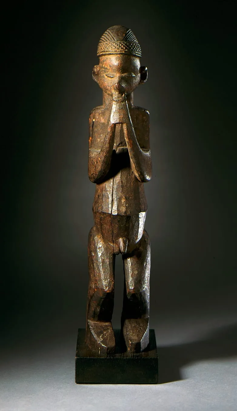 Carved wood figure of a standing person with arms raised and hands held to the mouth, with a crosshatched cap and faceted surface, mounted on a dark rectangular base