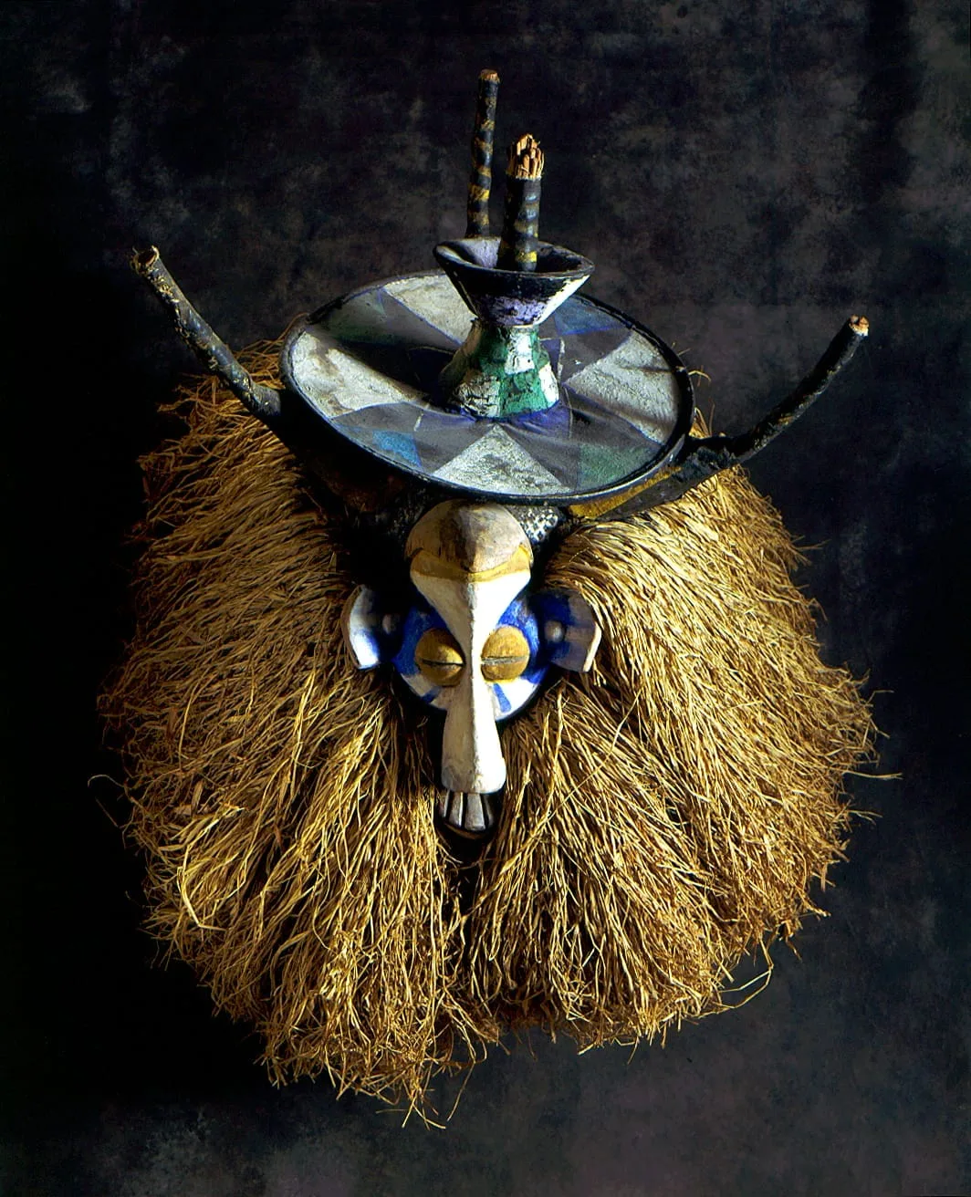 Ceremonial mask with carved white wooden face, brass disc eyes, and cobalt blue cheek plates, surrounded by a wide fringe of golden raffia fiber, topped with a metal disc hat and two vertical striped rods