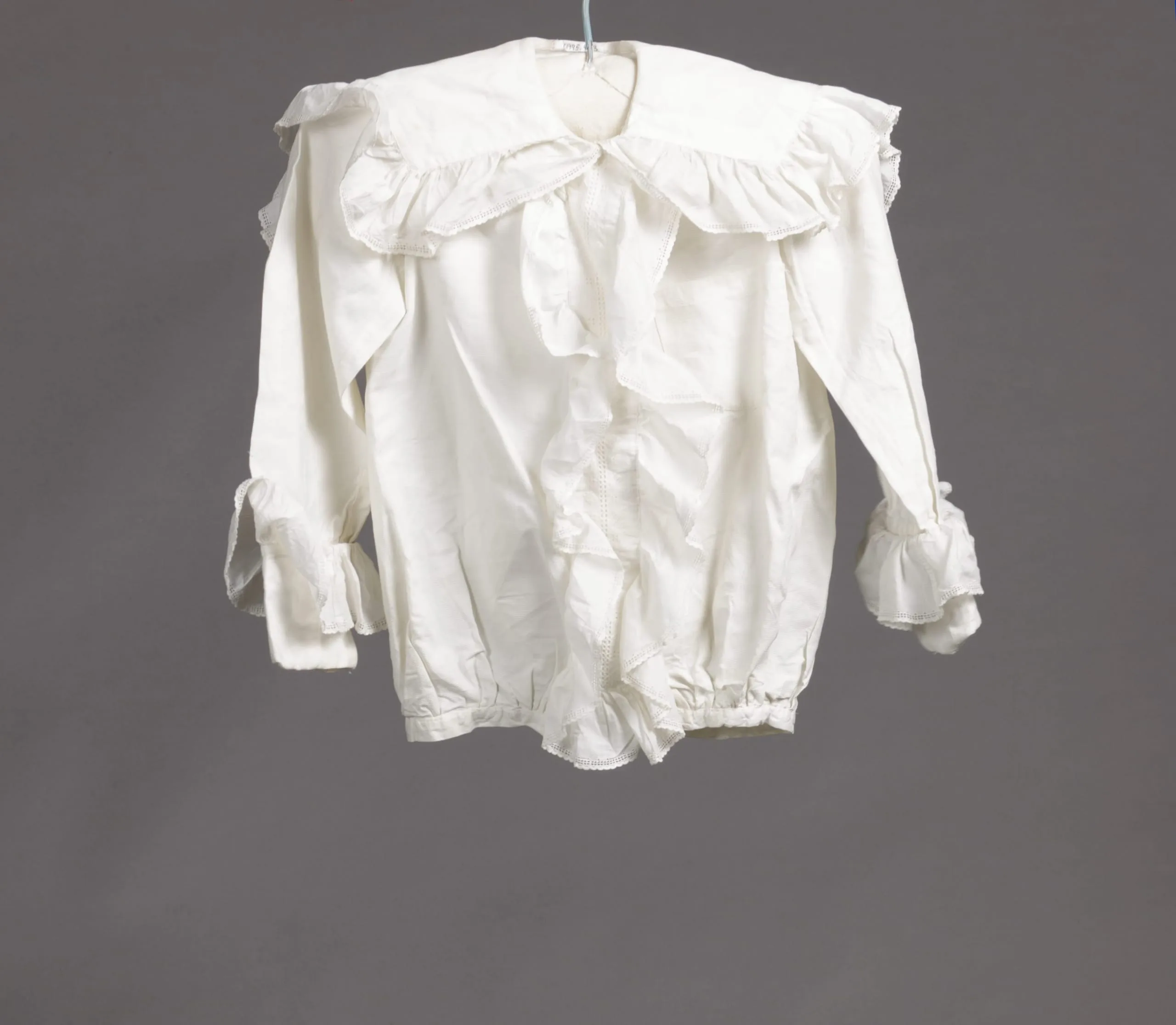 - Cotton plain weave (piqué) and linen plain weave, with cottom embroidery and mother-of-pearl buttons