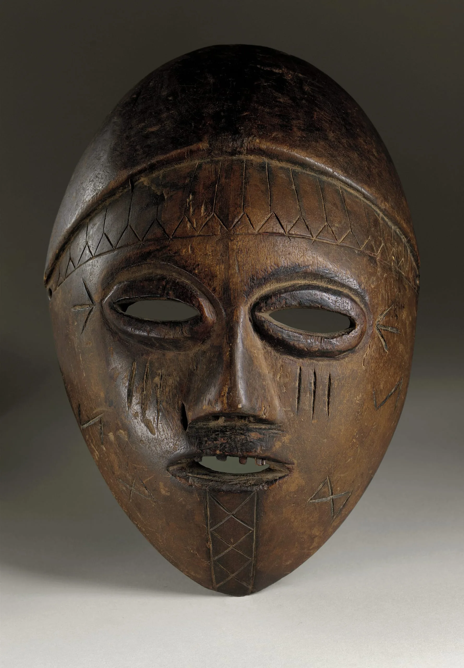 Carved wooden African mask with oval form, dark chestnut patina, incised geometric patterns, almond-shaped eye openings, and carved facial features