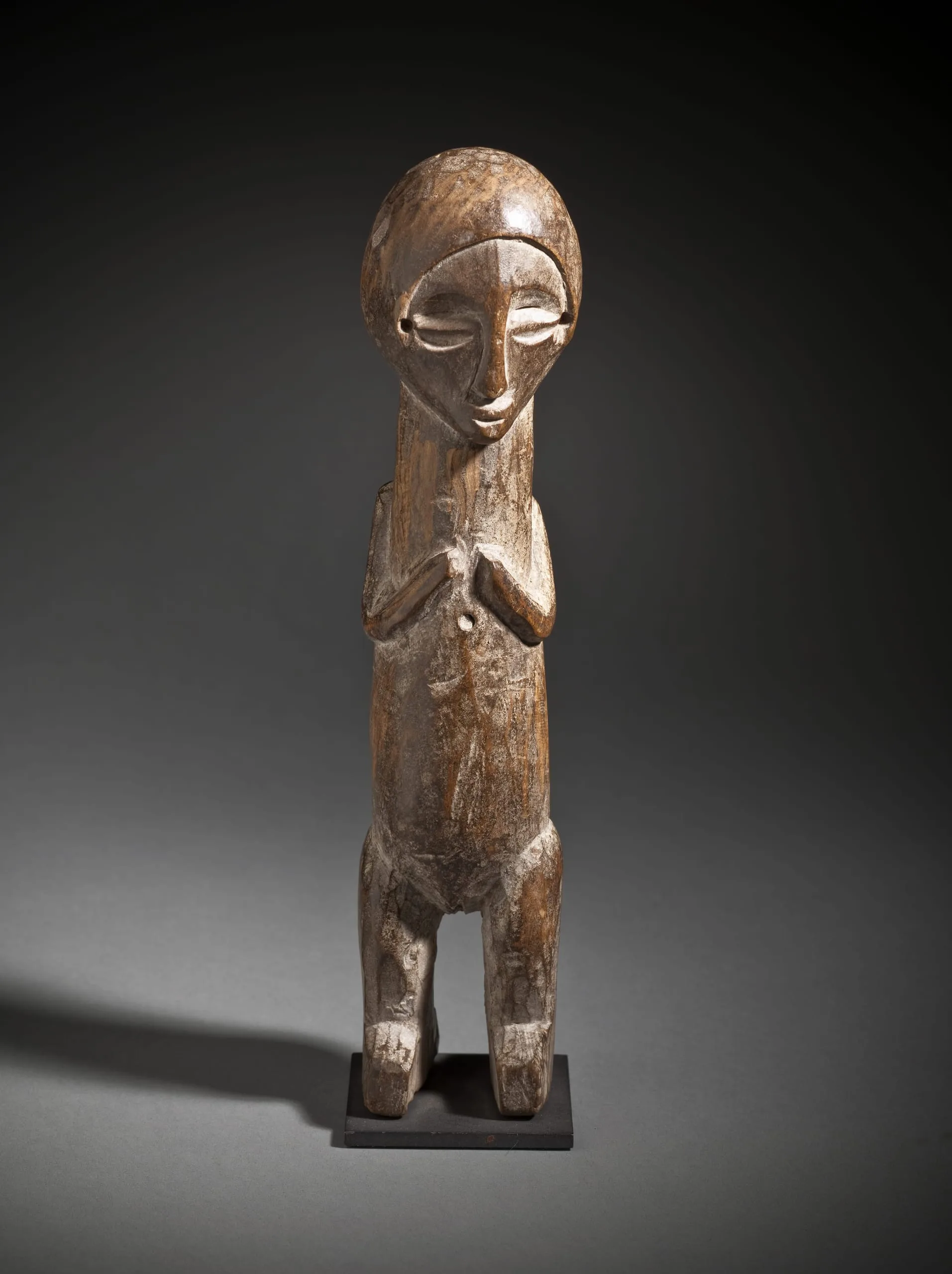 Carved wood figure with rounded head, elongated neck, clasped hands at chest, and short legs, with worn peanut-brown surface and traces of white pigment