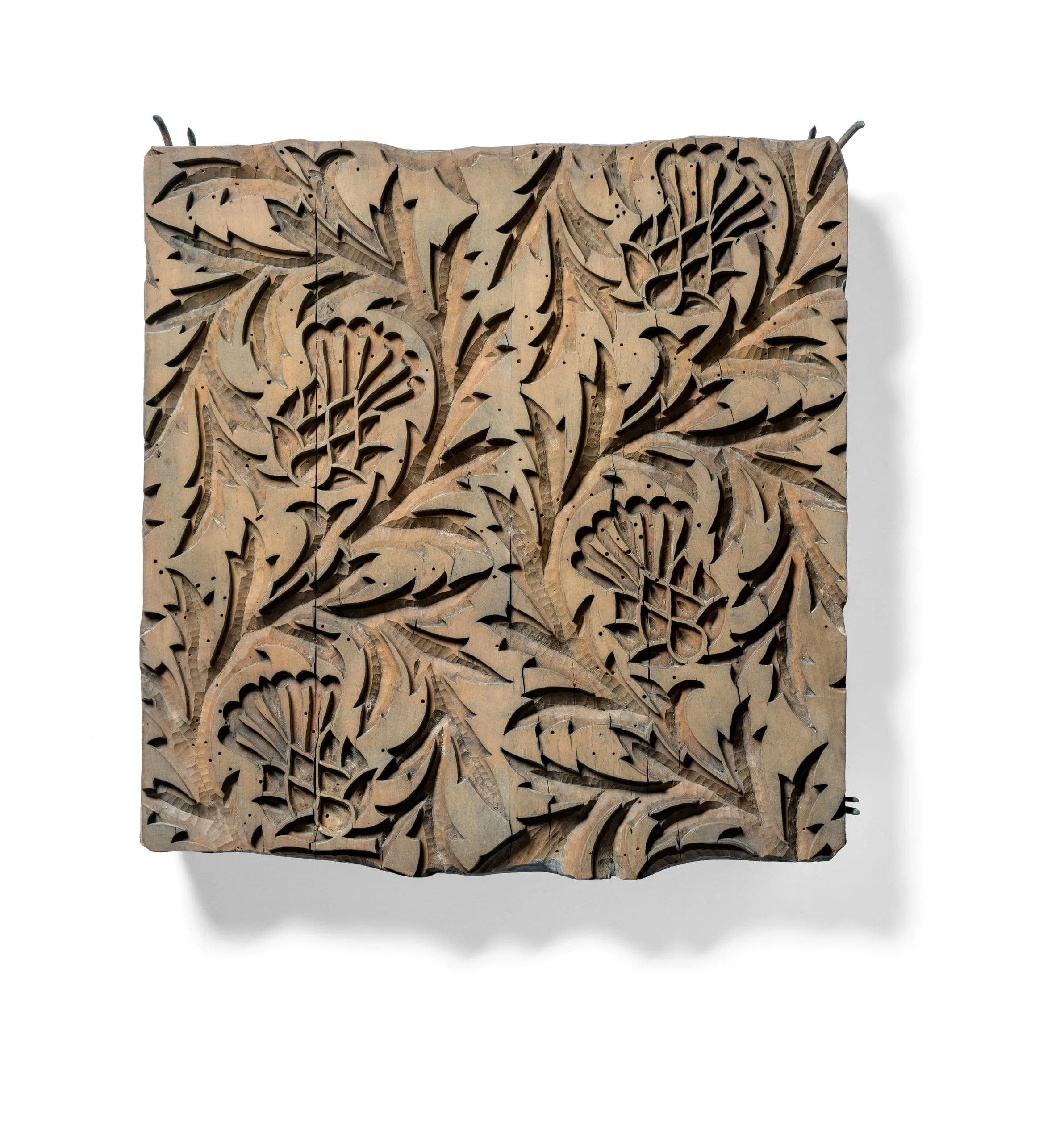 Square wall-mounted relief panel in oxidized metal, covered with an allover carved pattern of thistle-like blossoms and jagged leaves with cut-through negative space