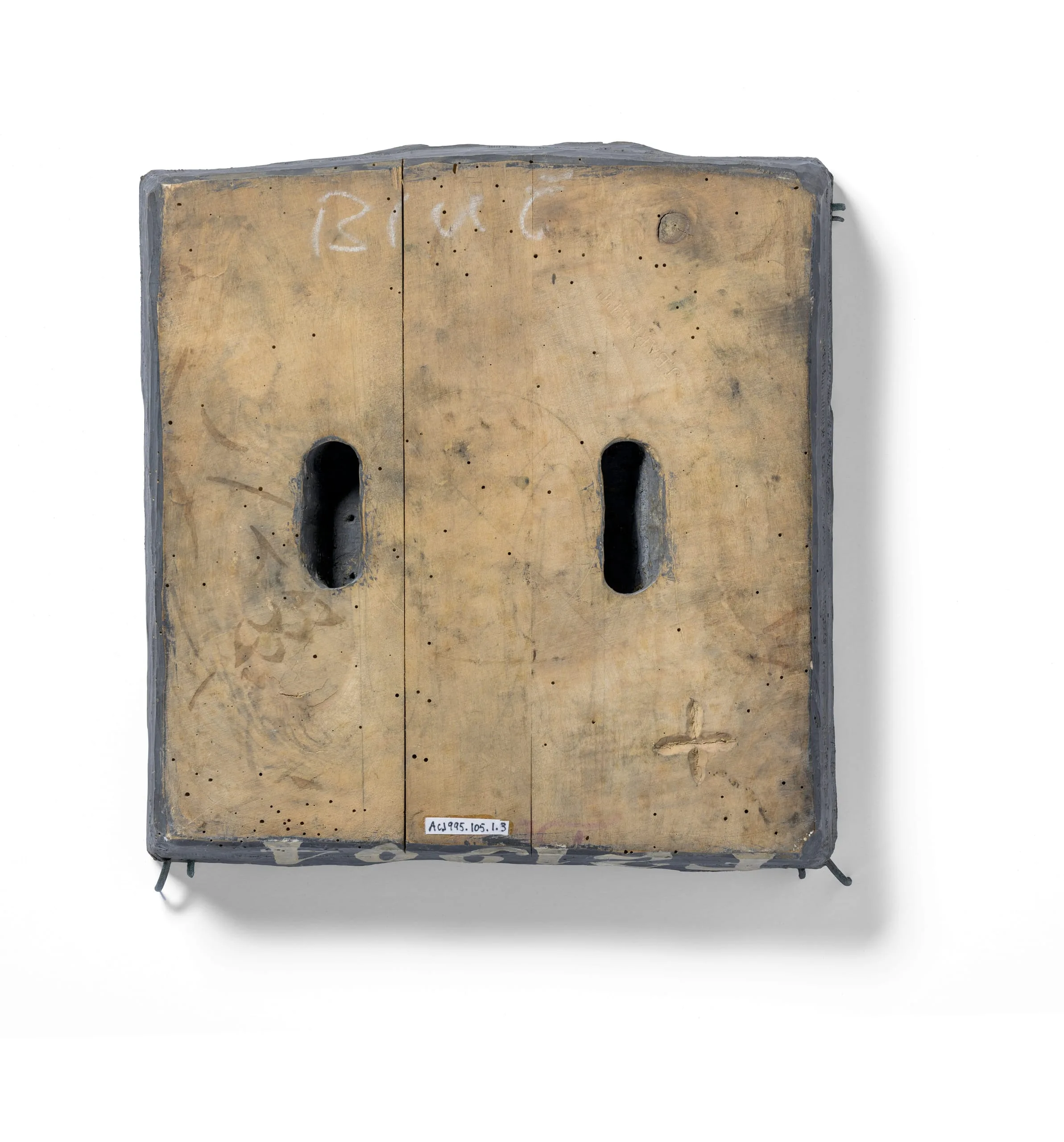 Rectangular mixed-media object with aged, tan-colored surface divided into two panels by a central seam, each panel bearing an oval cutout opening; gray fabric or metal edging frames the perimeter; scattered small holes, faint markings, chalked lettering, and a cross-shaped mark visible on the worn surface.