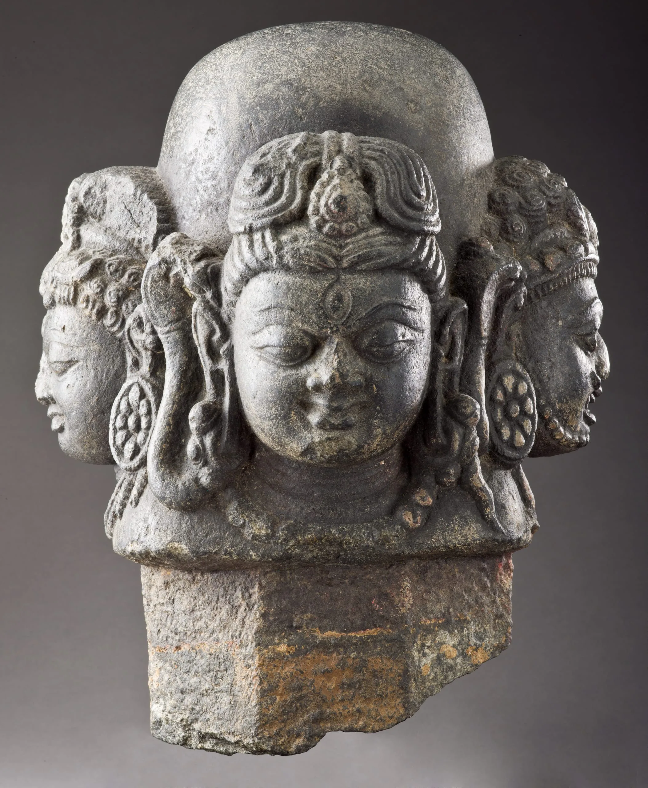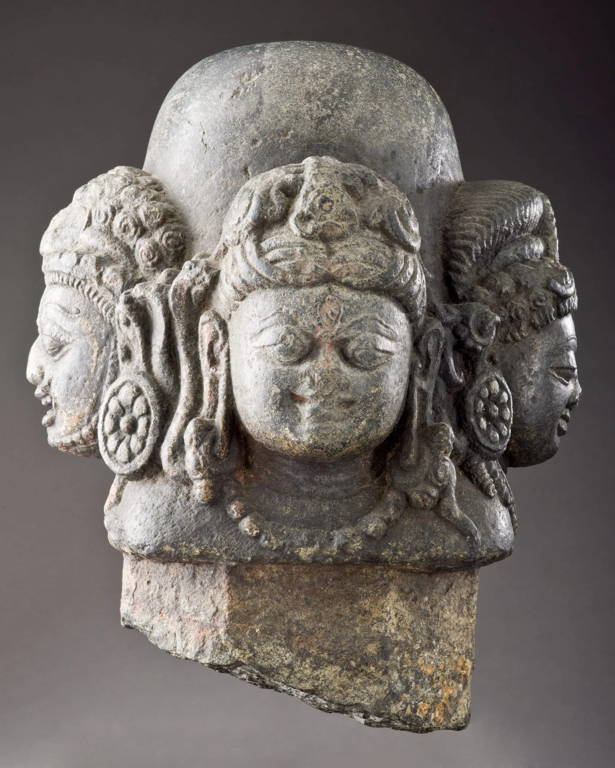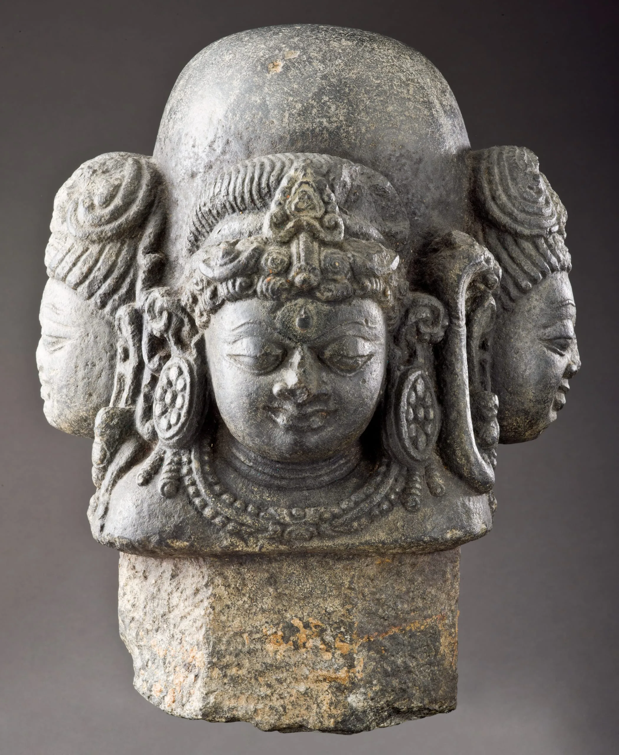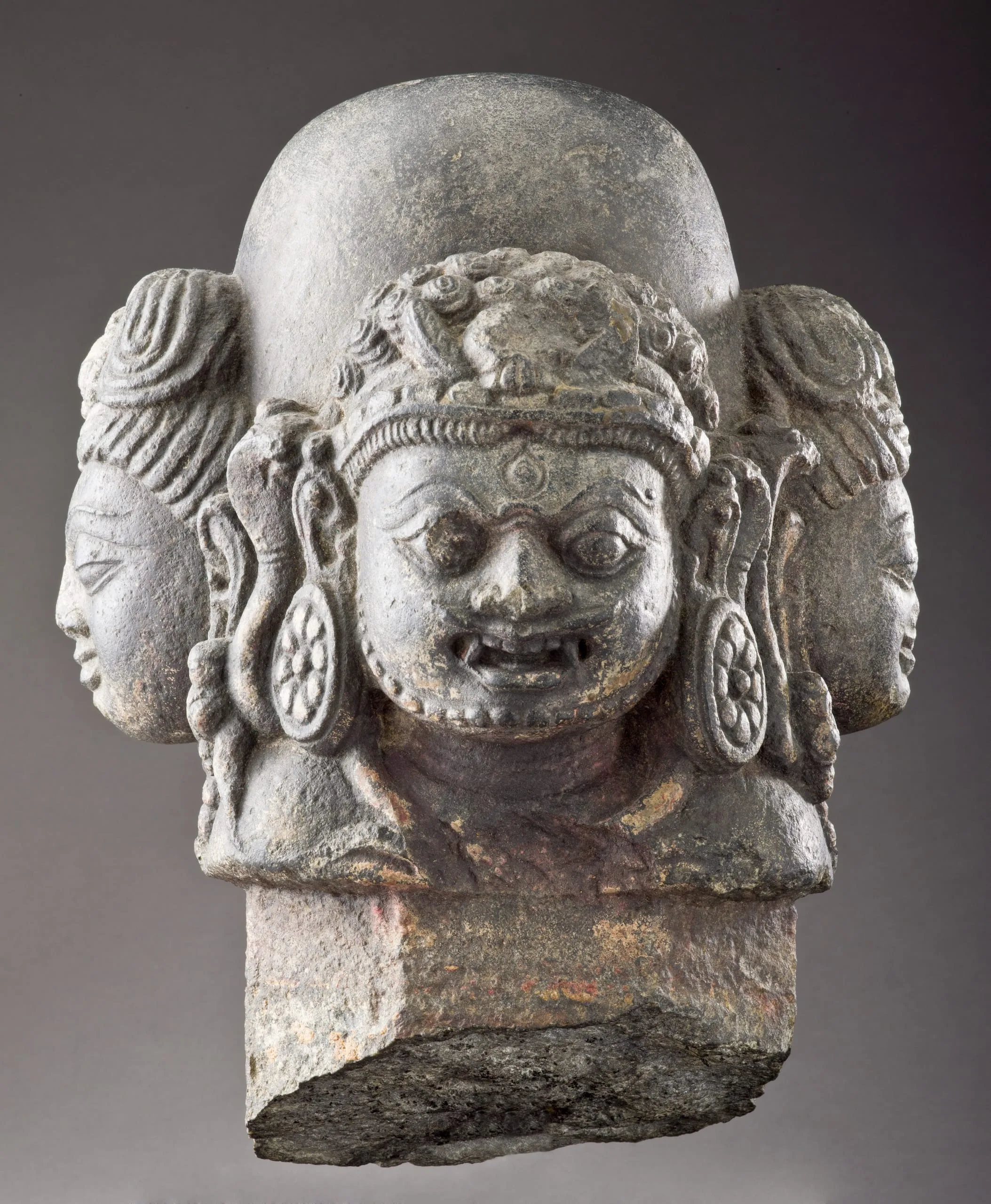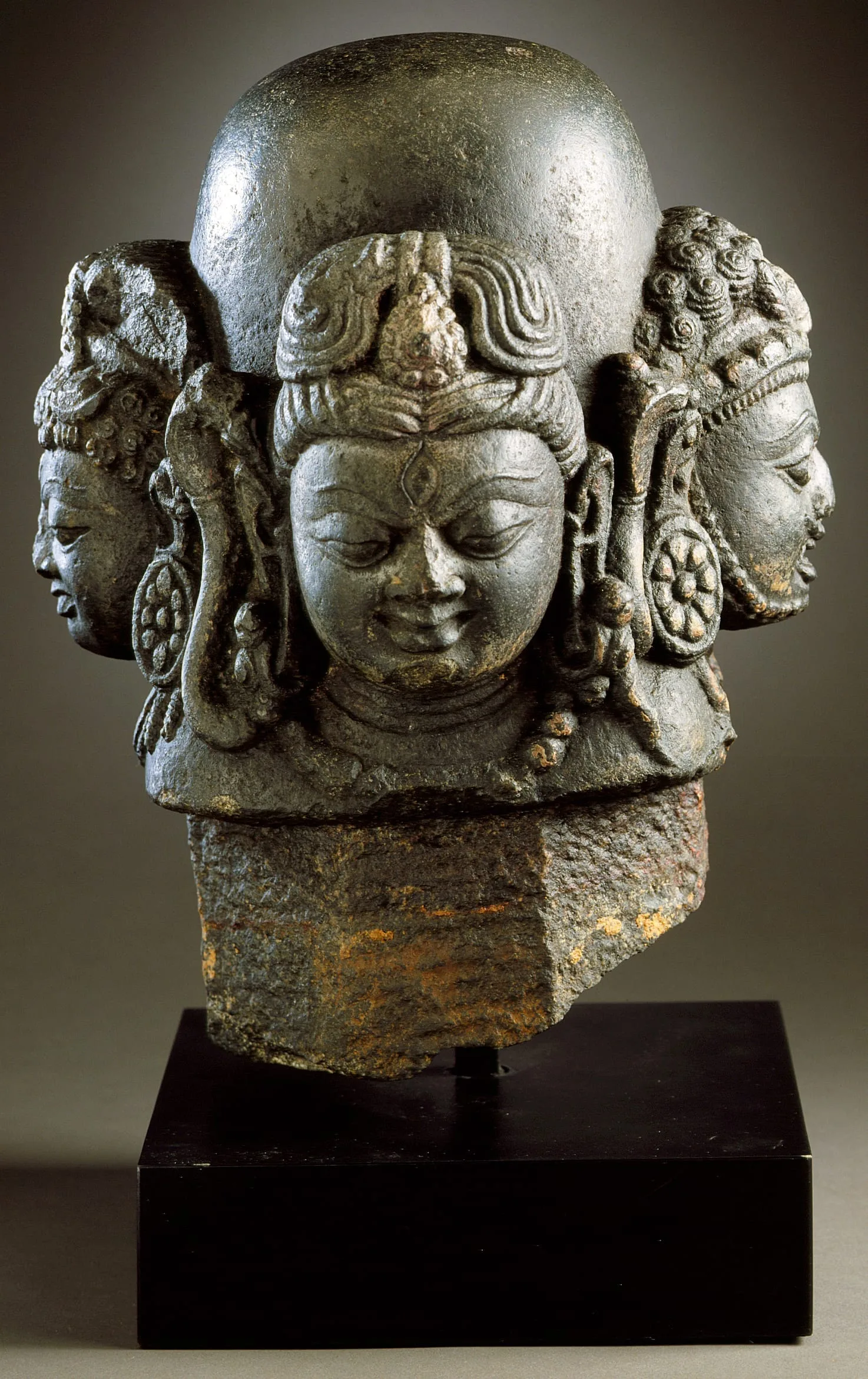 Since around the beginning of the Common Era, the Shivalinga (literally, the "sign" of Shiva) has been the quintessential symbol and artistic form used to represent the major Hindu god Shiva. In its core conception imagined as an aniconic column, the Shivalinga symbolizes the deity’s transcendental nature and primordial potency. As iconic imagery became increasingly prevalent in South Asian art, the Shivalinga was anthropomorphized by the addition of Shiva’s head emerging from the stone column in order to provide worshippers with a physical form that was considered more accessible than the abstract expression of his imperceptible reality. Multiple heads of Shiva were subsequently added to represent different philosophical aspects of the god. To seek blessings from Shiva, devotees worship lingas with ritual offerings of flowers, food, and incense. The deity’s large eyes and welcoming gaze are thought to help worshippers establish a personal spiritual bond, thus strengthening the power of their offering.