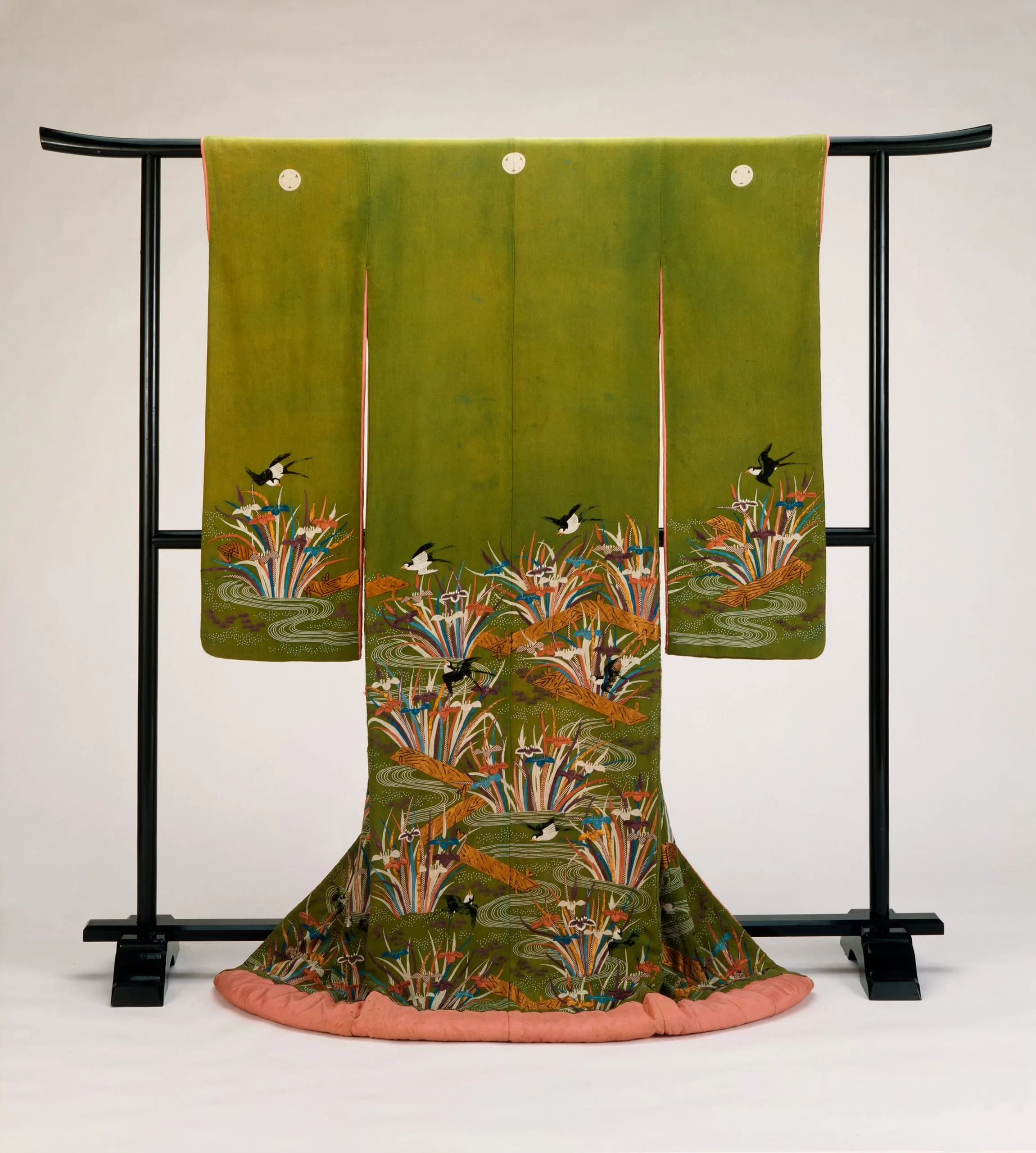 - Woman’s Outer Kimono (Uchikake) with Plank Bridges, Irises, and Swallows