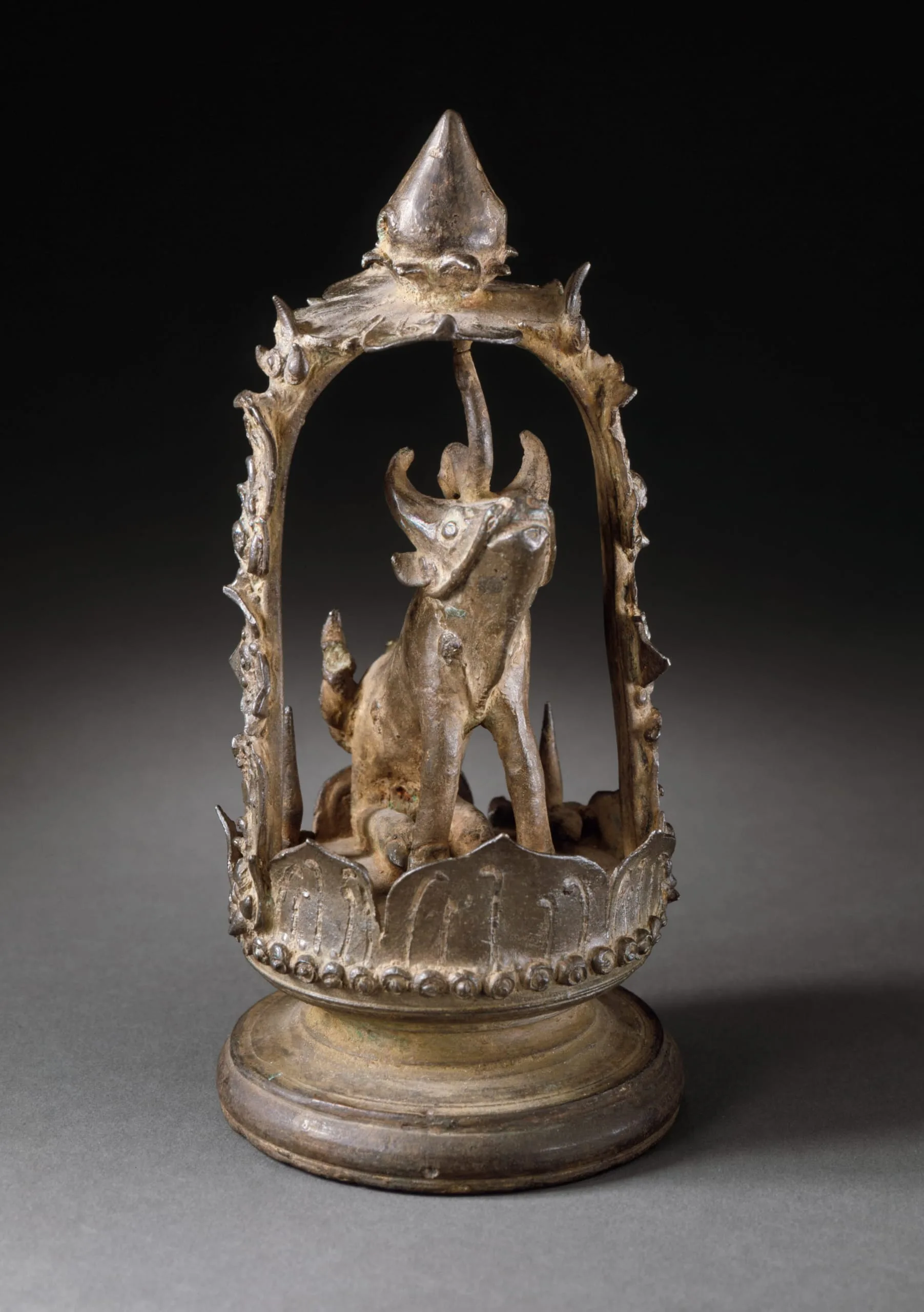 This lamp was likely a hanging lamp, as the lotus bud finial on the blossoming lotus arch may have originally been encircled with a trilobed hanging loop. Beneath the arch, a bull crouches on his haunches and rears upward. In Javanese culture, the bull symbolizes immense strength, resilience, agricultural fertility, and community heritage. They are believed to guide souls to the afterlife. Upright lotus petals form an enclosure border at the bull’s foot level. The lamp has a pedestal base.