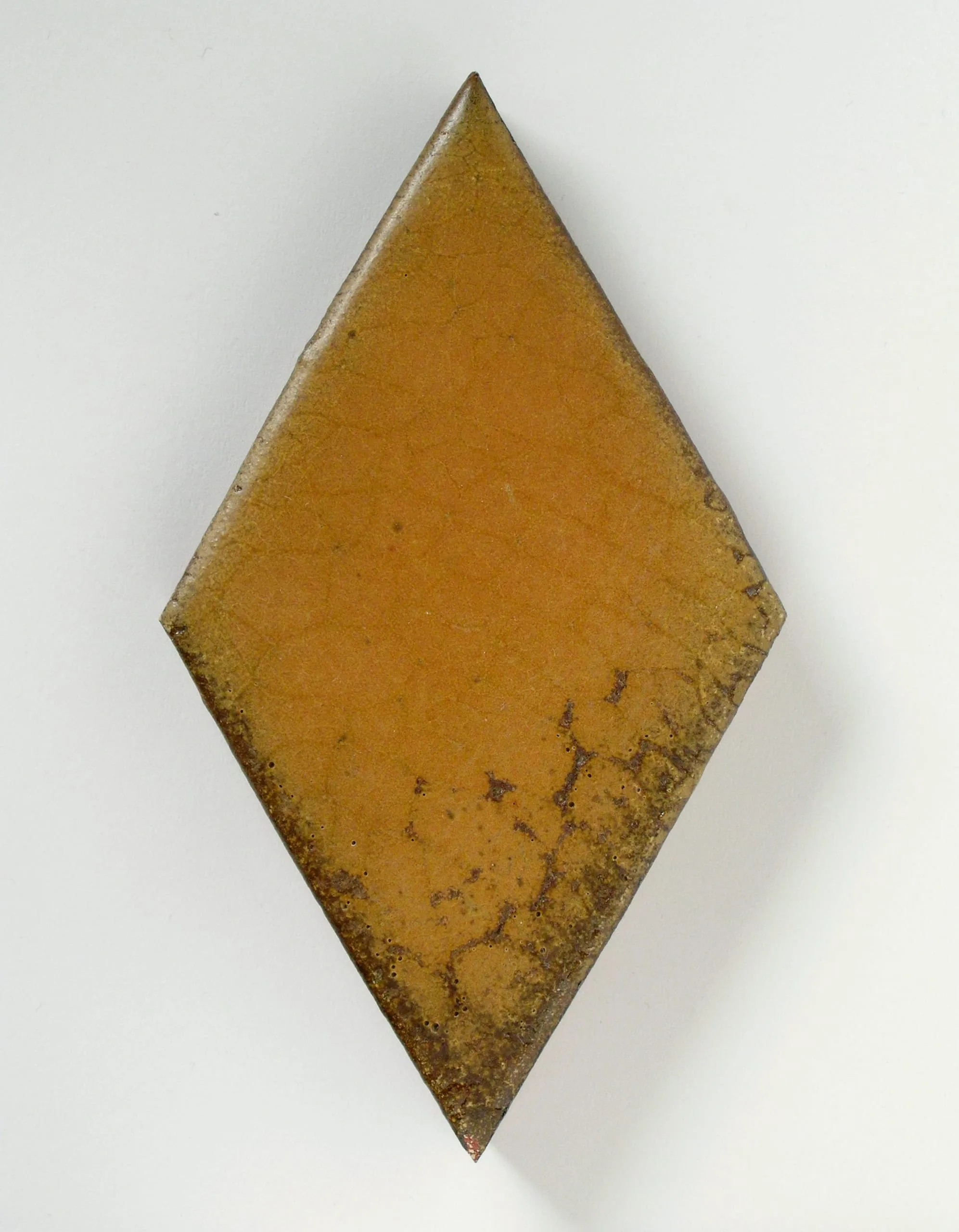 Diamond-shaped ceramic floor or wall tile with amber and mustard-yellow lead glaze, heavily crazed with dark brown hairline cracks across the surface
