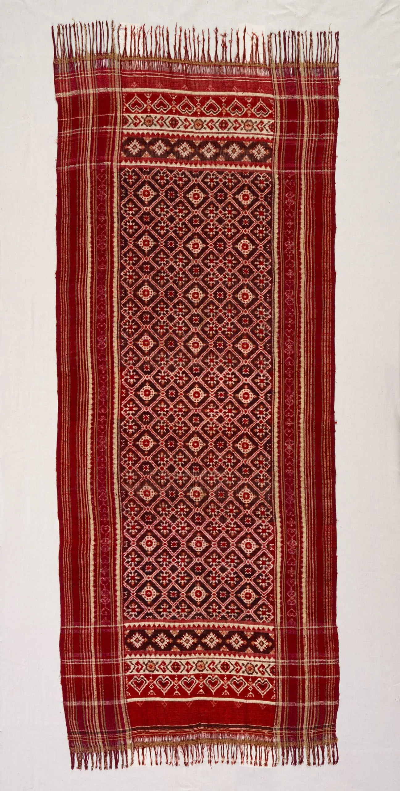 - Silk, resist-dyed warp and weft (double ikat), plain weave