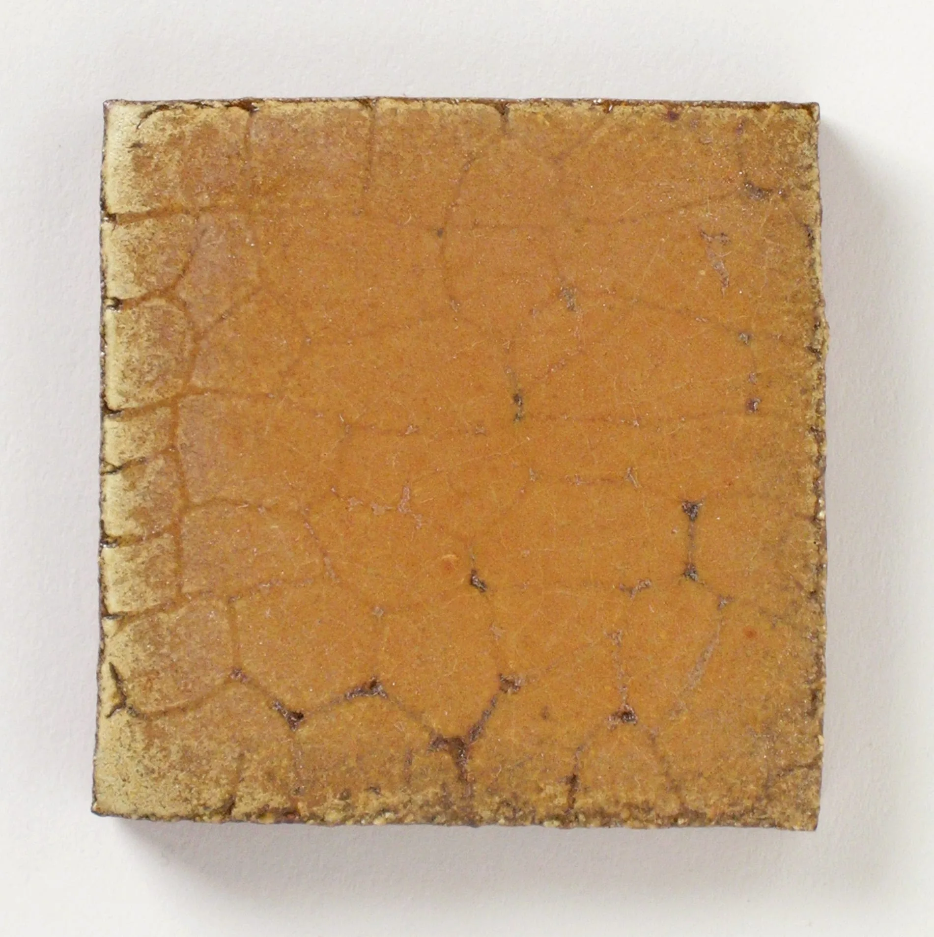 Small square ceramic tile with amber-orange crackled glaze, viewed slightly from above, showing irregular crazing pattern and rough gilded edges