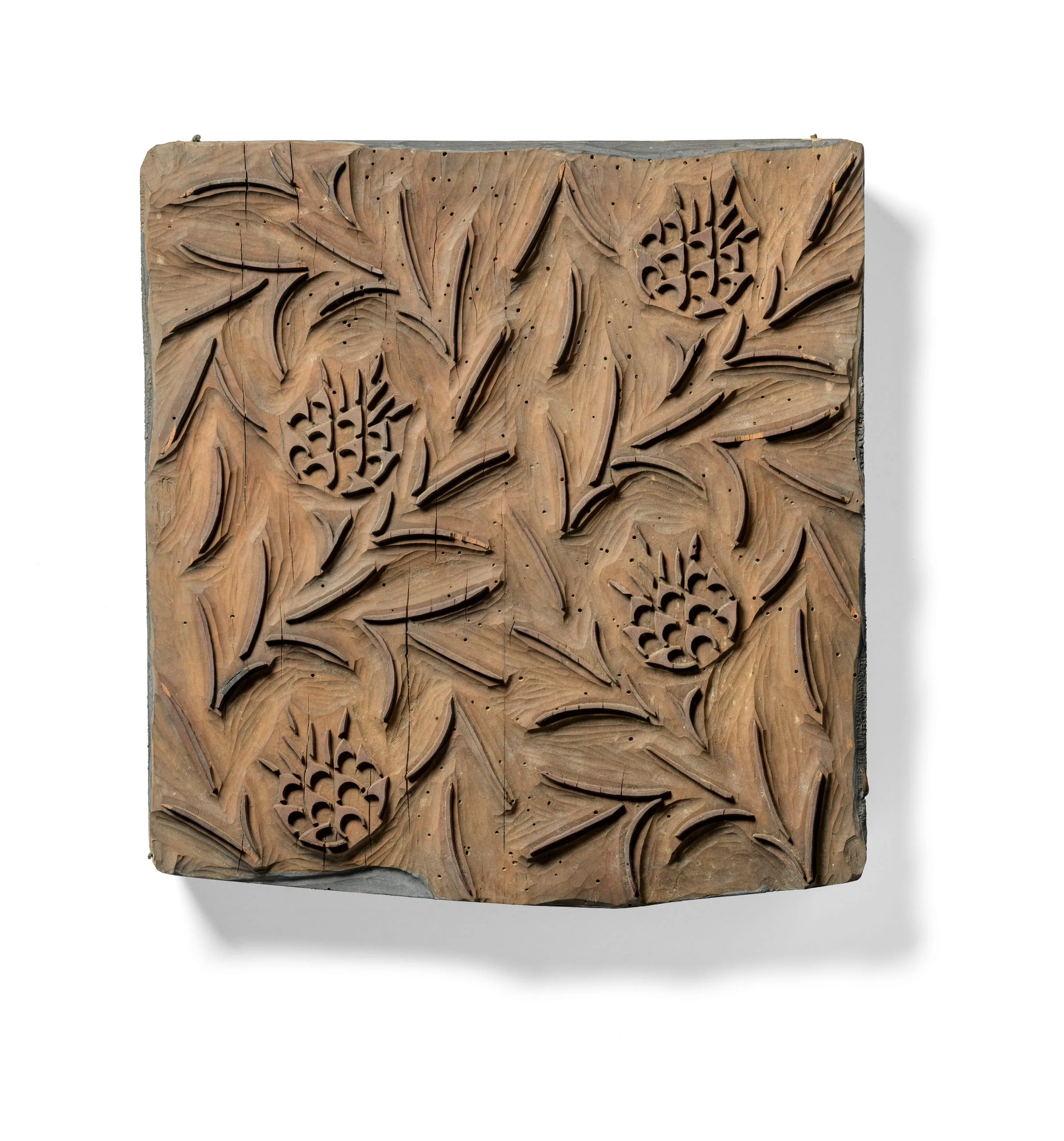 Wooden textile printing block carved in relief with a repeating pattern of thistle-like flower heads and sweeping pointed leaves, warm peanut-brown wood with slate gray painted sides