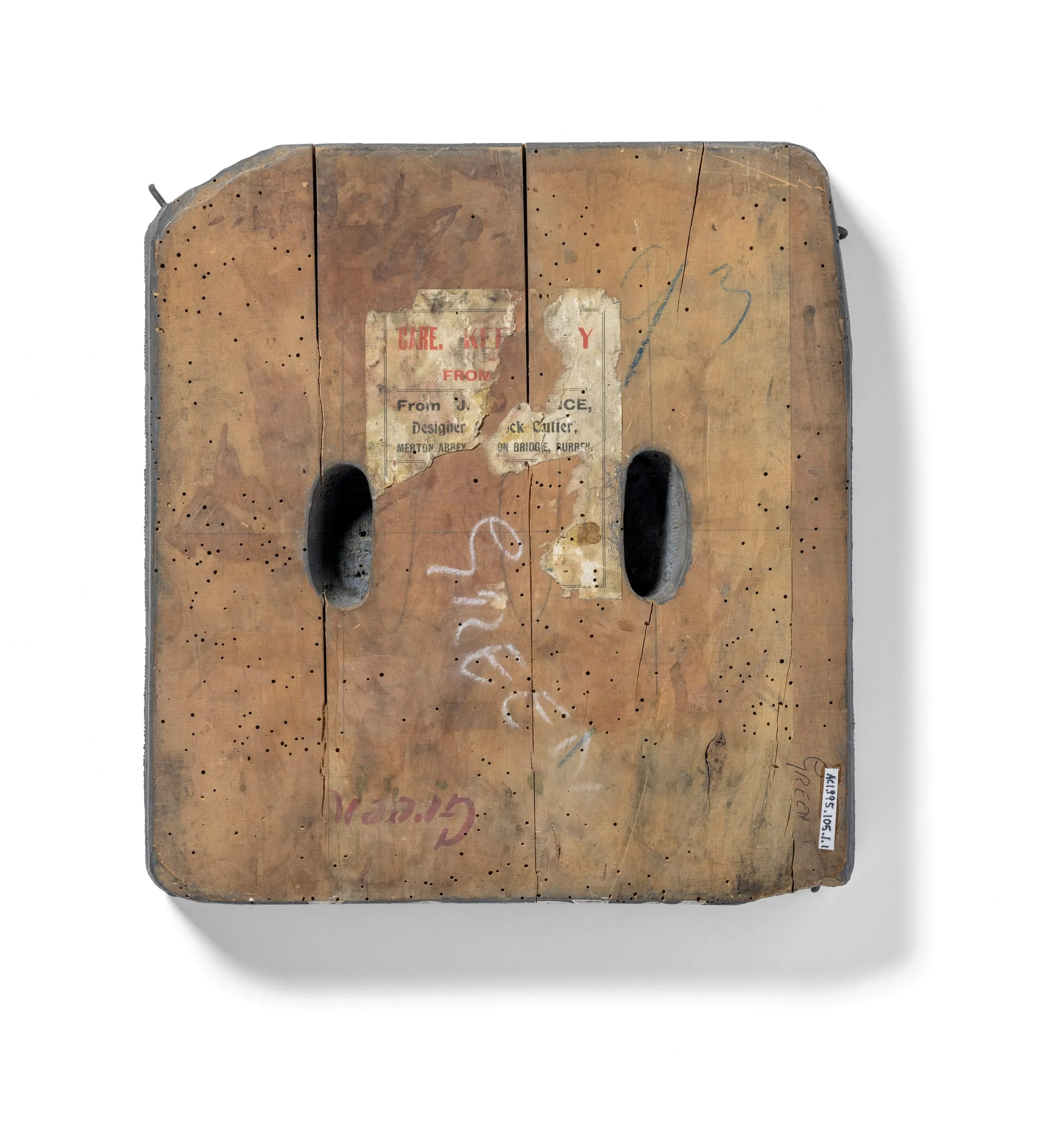 Mixed-media assemblage using a worn wooden board with gray padded edges, two oval cutouts, scattered nail holes, a partially legible paper label with red printed text, and handwritten chalk markings across the surface.