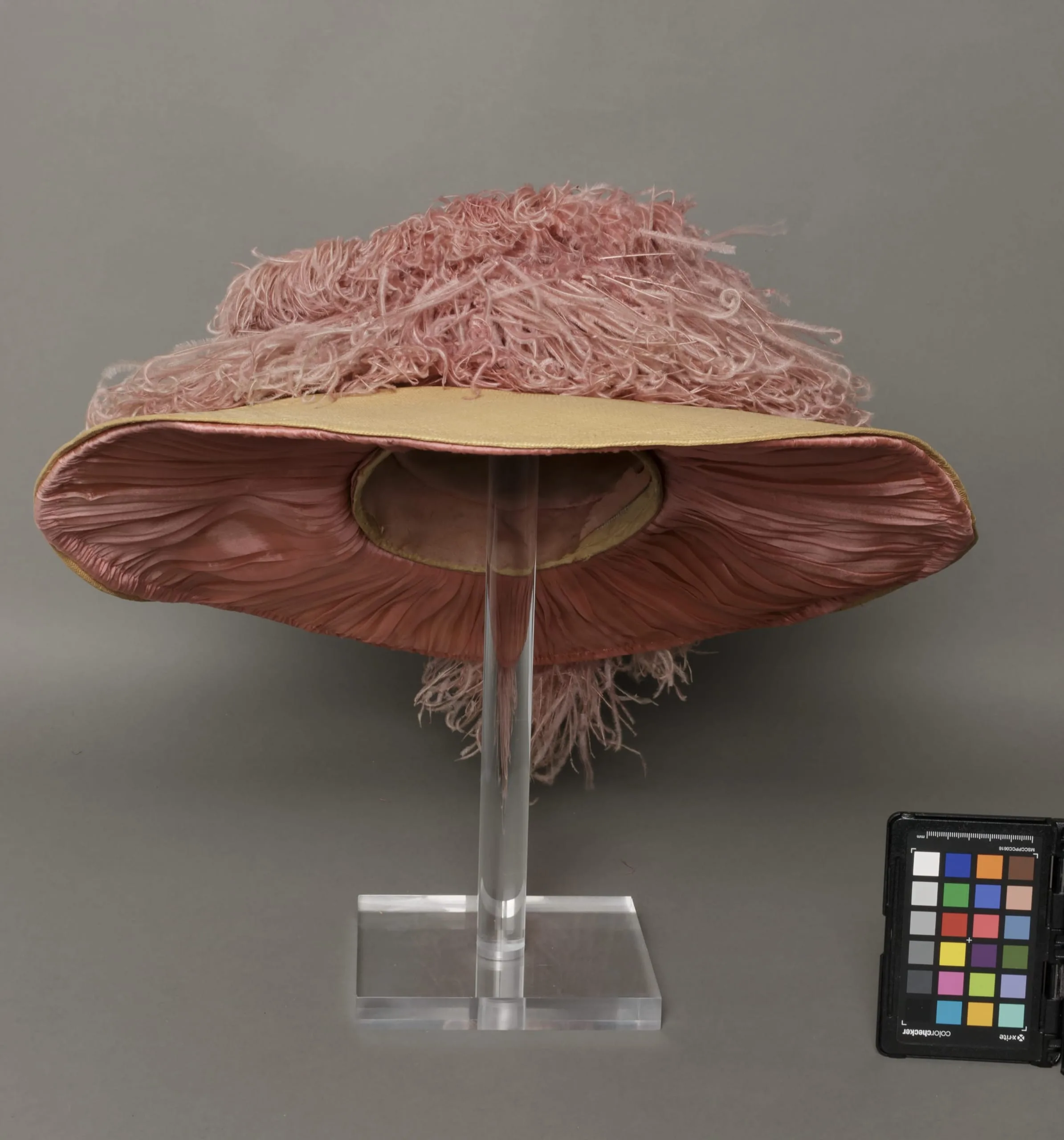 - Straw, silk chiffon, and ostrich feathers