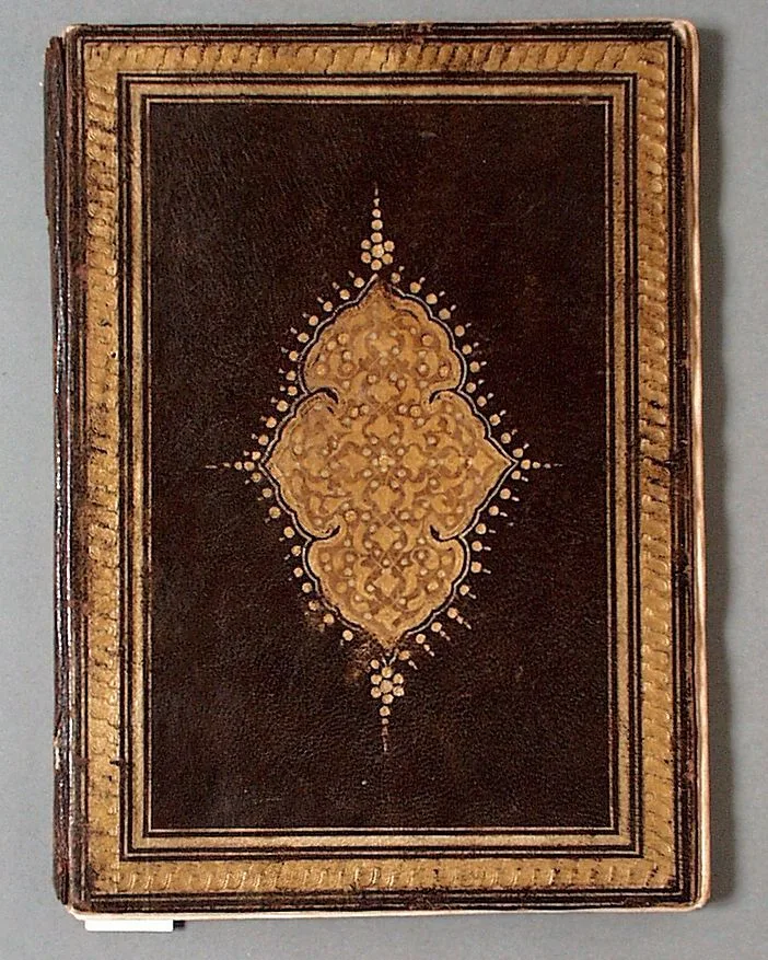manuscript with gold-stamped designs of a twisting border and multilobed shamsa.