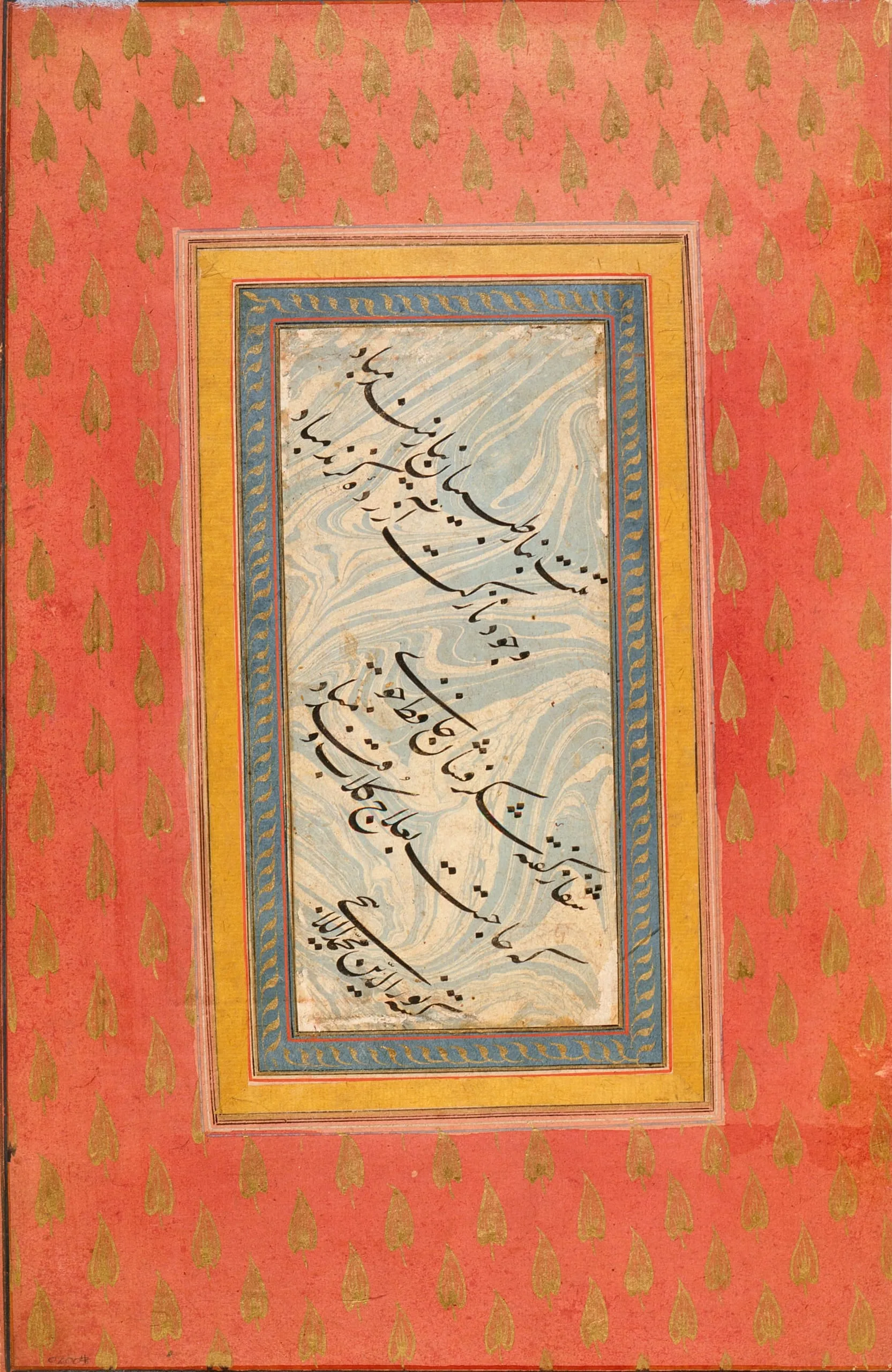 Recto: Calligraphy on marbled paper consisting of couplets of a ghazal (amatory poem) by the Persian poet Hafiz (1327-1390).