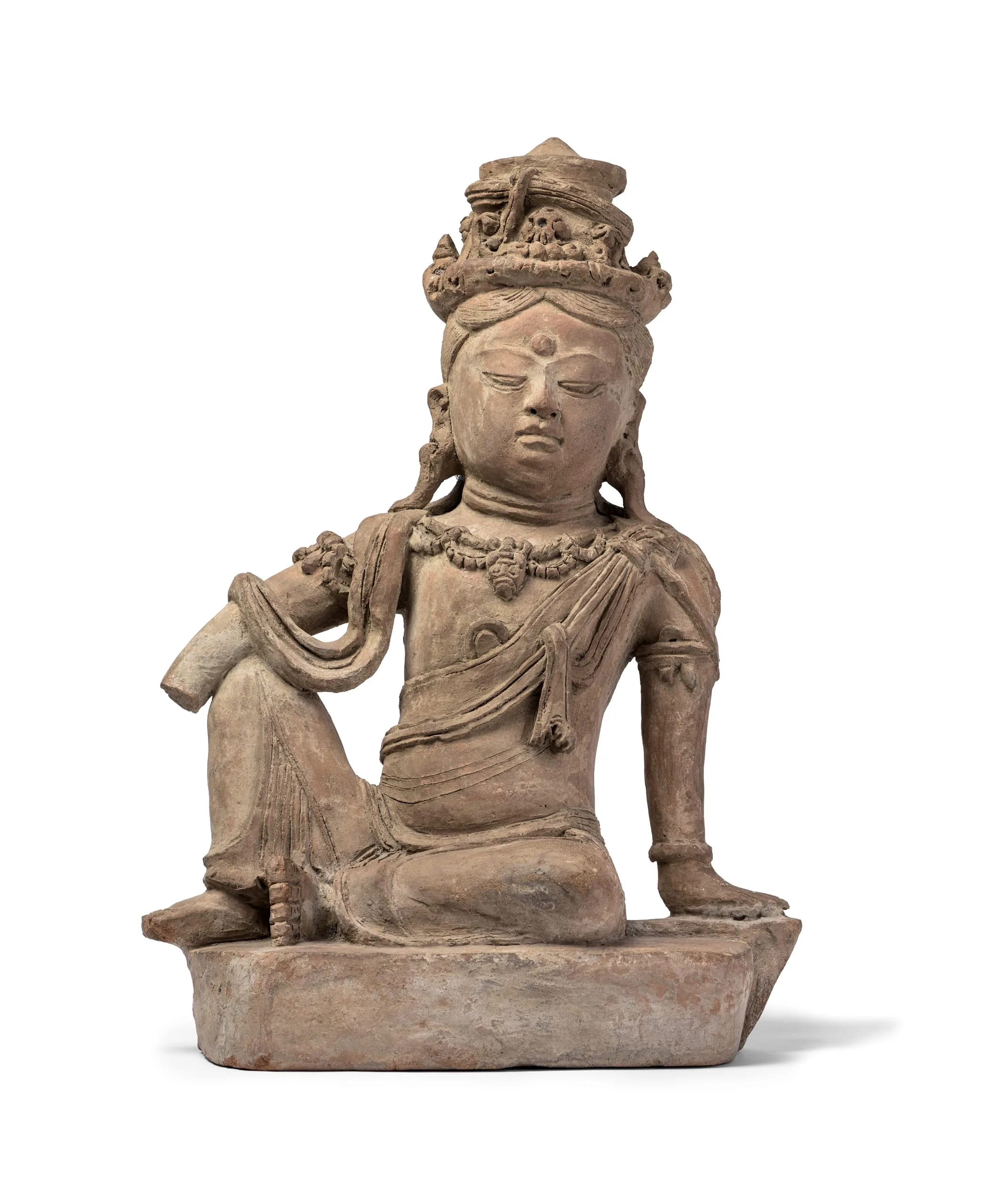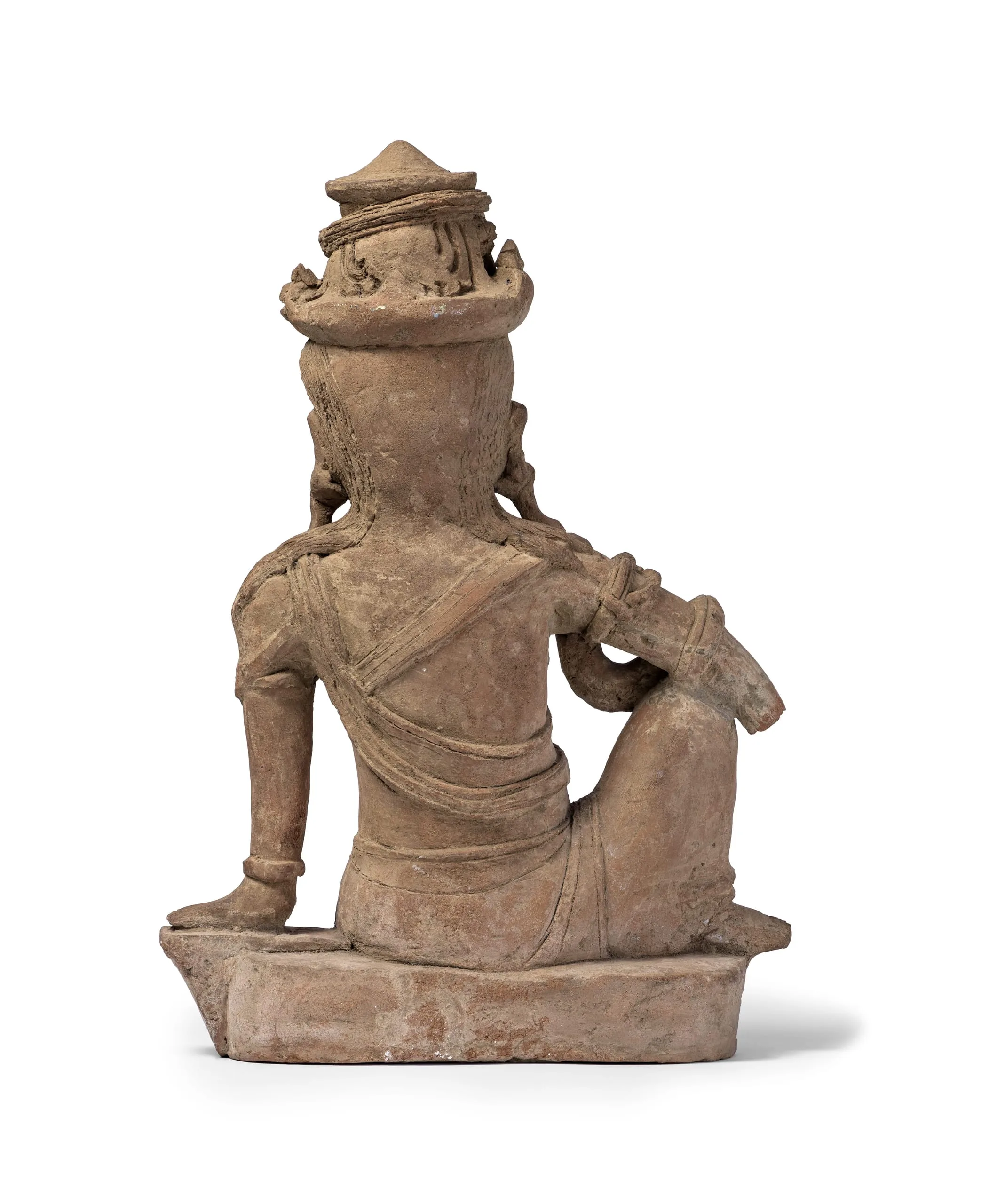 Chinese merchant immigrants and their descendants have lived in Indonesia, especially eastern Java, since at least the 13th century. Pratapaditya Pal has speculated that this earthenware sculpture may have been based on a pilgrim’s votive model of a Chinese image fashioned in this distinctive posture. (Pal 1987, 74-75, no. 38). For a later Burmese form of Avalokiteshvara seated in this pose, see AC1995.103.1.