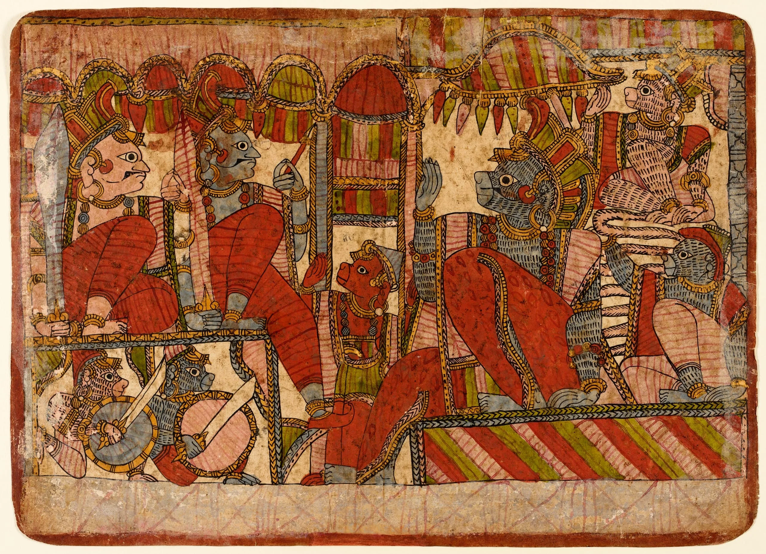 - Rama and Lakshmana at Conference with Sugriva, the Simian King, and Companions, Scene from the Story of the Burning of Lanka, Folio from a Ramayana (Adventures of Rama)
