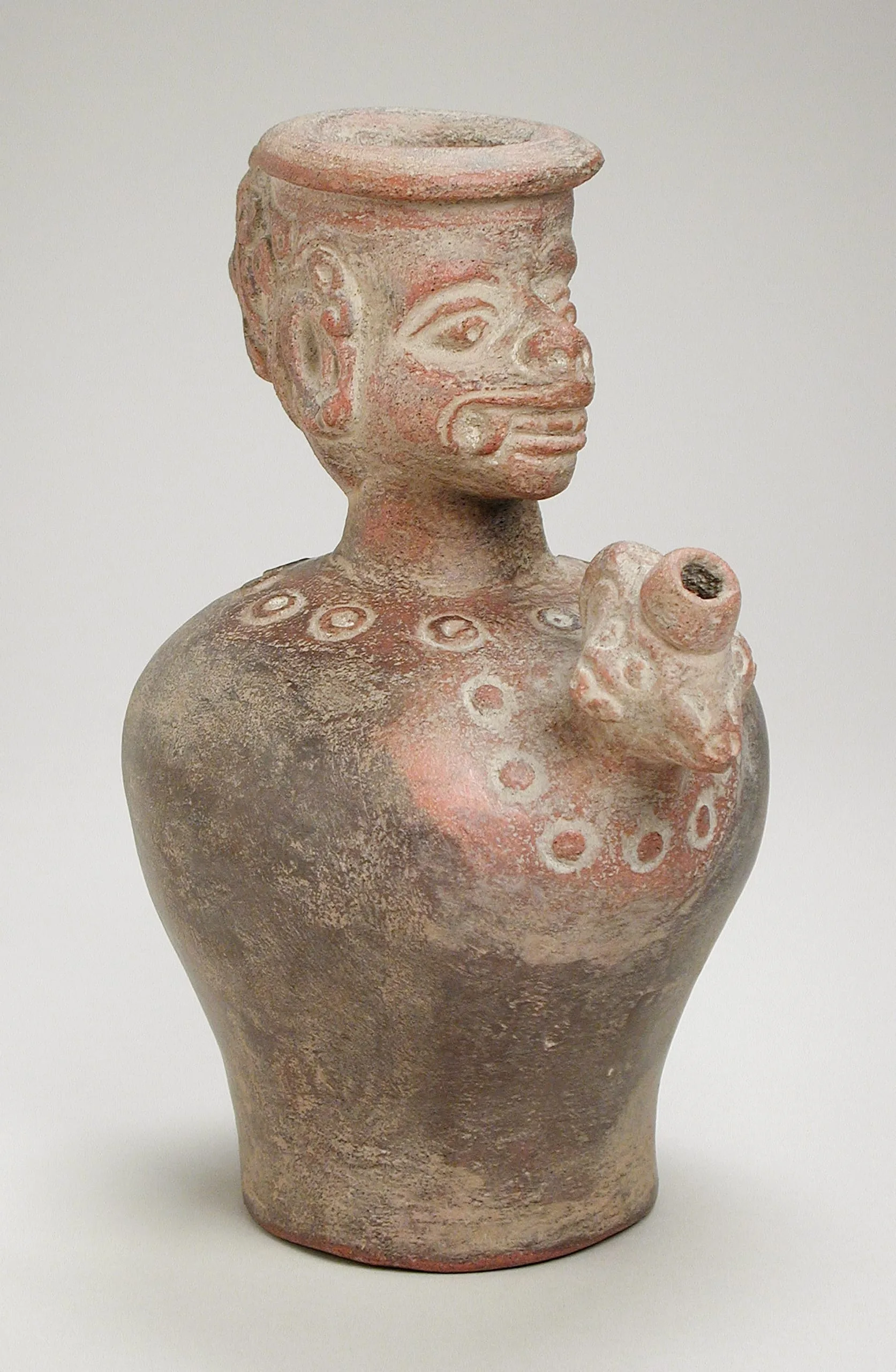 The flattened cylinder atop Hanuman’s head is the lower rim for a now-missing lid (see also M.86.346.1). The Divine Monkey is wide-eyed, mustachioed, and growling with prominent fangs. He wears a necklace of round ornaments. The vessel spout is in the form of conjoined simian faces.