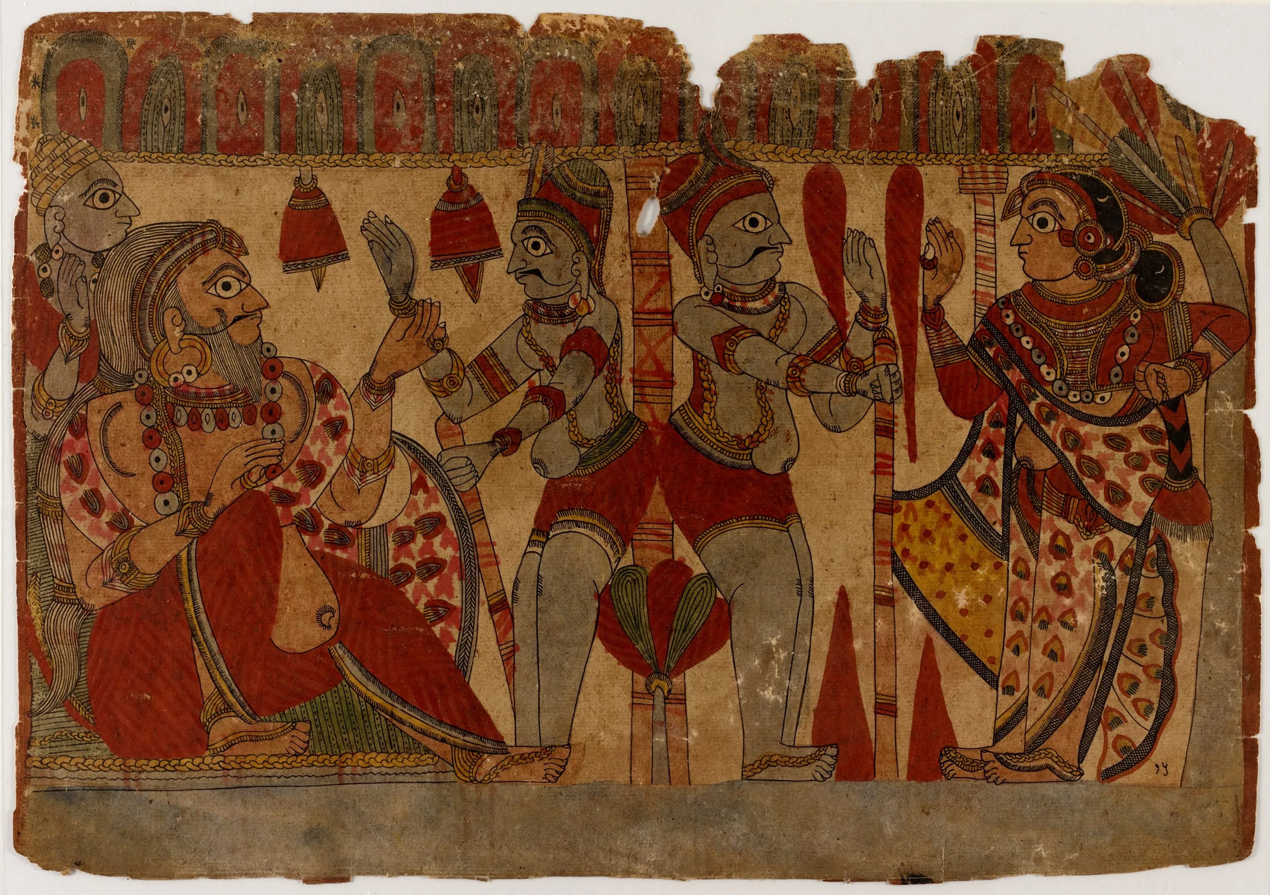 - Unidentified Scene- A heroic man seated on the left holds the hand of another, and on the right a man and woman converse, Scene from the Story of the Marriage of Abhimanyu and Vatsala, Folio from a Mahabharata ([War of the] Great Bharatas)