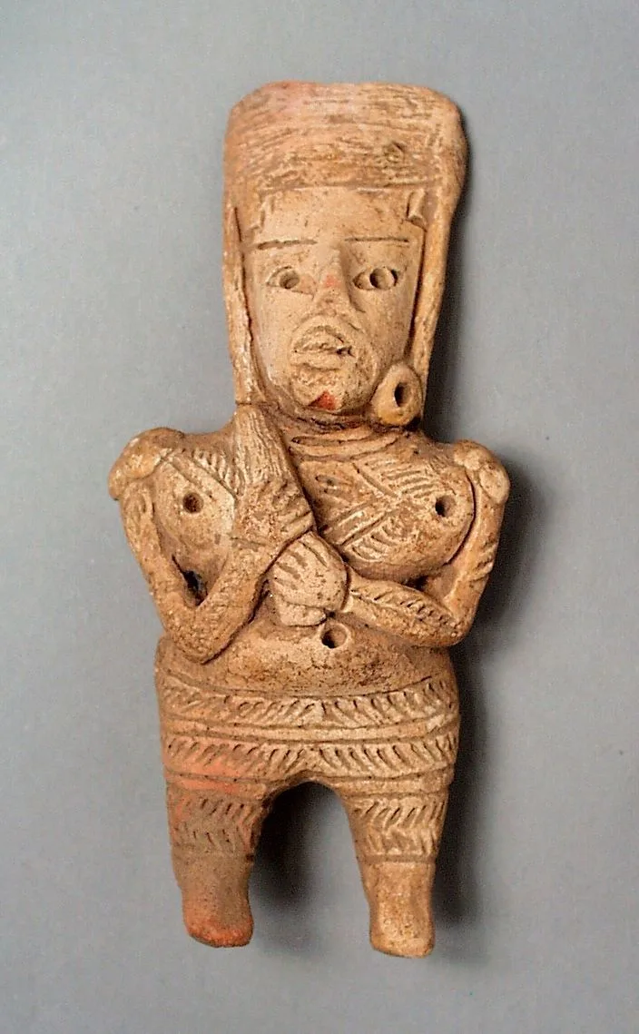 Small pre-Columbian terracotta figurine of a standing human form with a trapezoidal headdress, crossed arms, and incised geometric patterns on a skirt-like lower garment