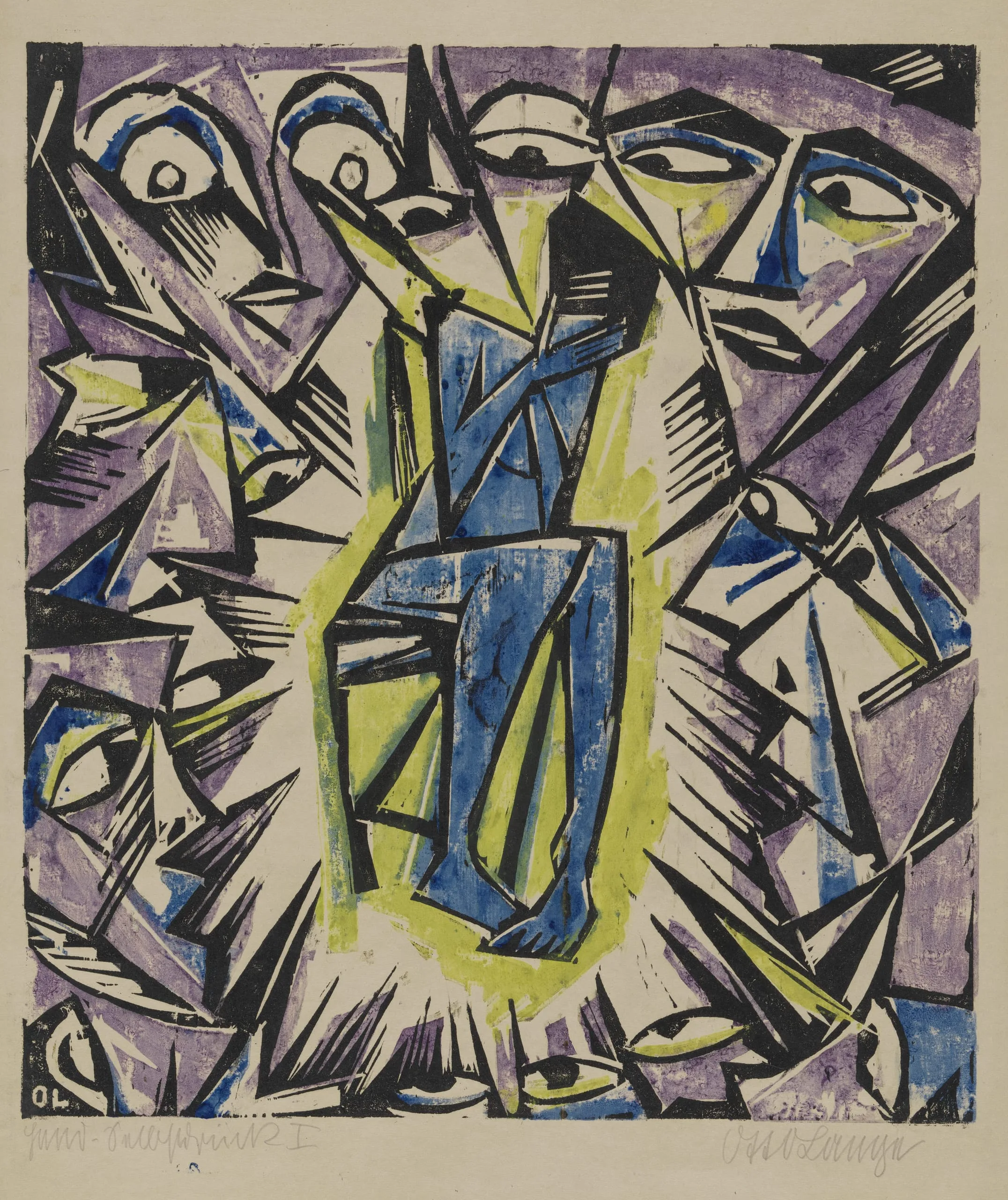 - Woodcut and color monotype printed in green, blue, purple and black on heavy wove paper