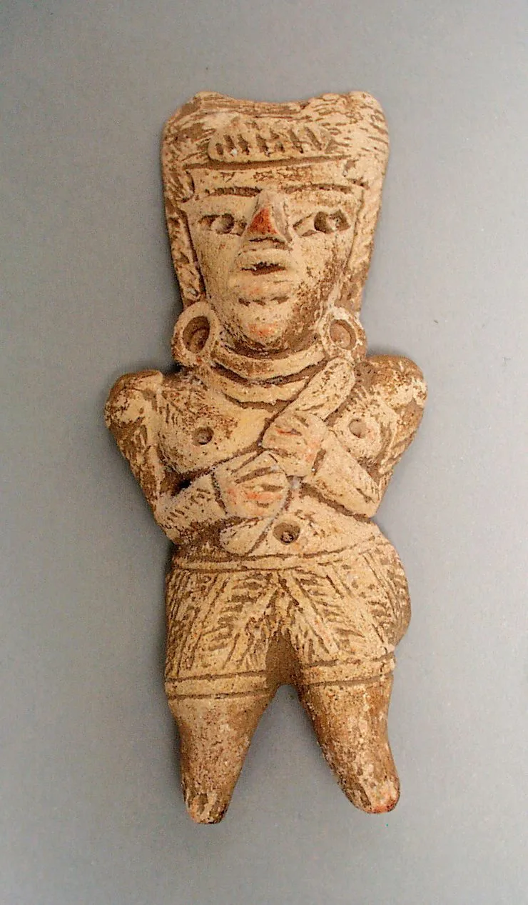 Small pre-Columbian ceramic figure, standing human form with crossed arms, incised geometric decoration, headdress, and traces of red and cream pigment