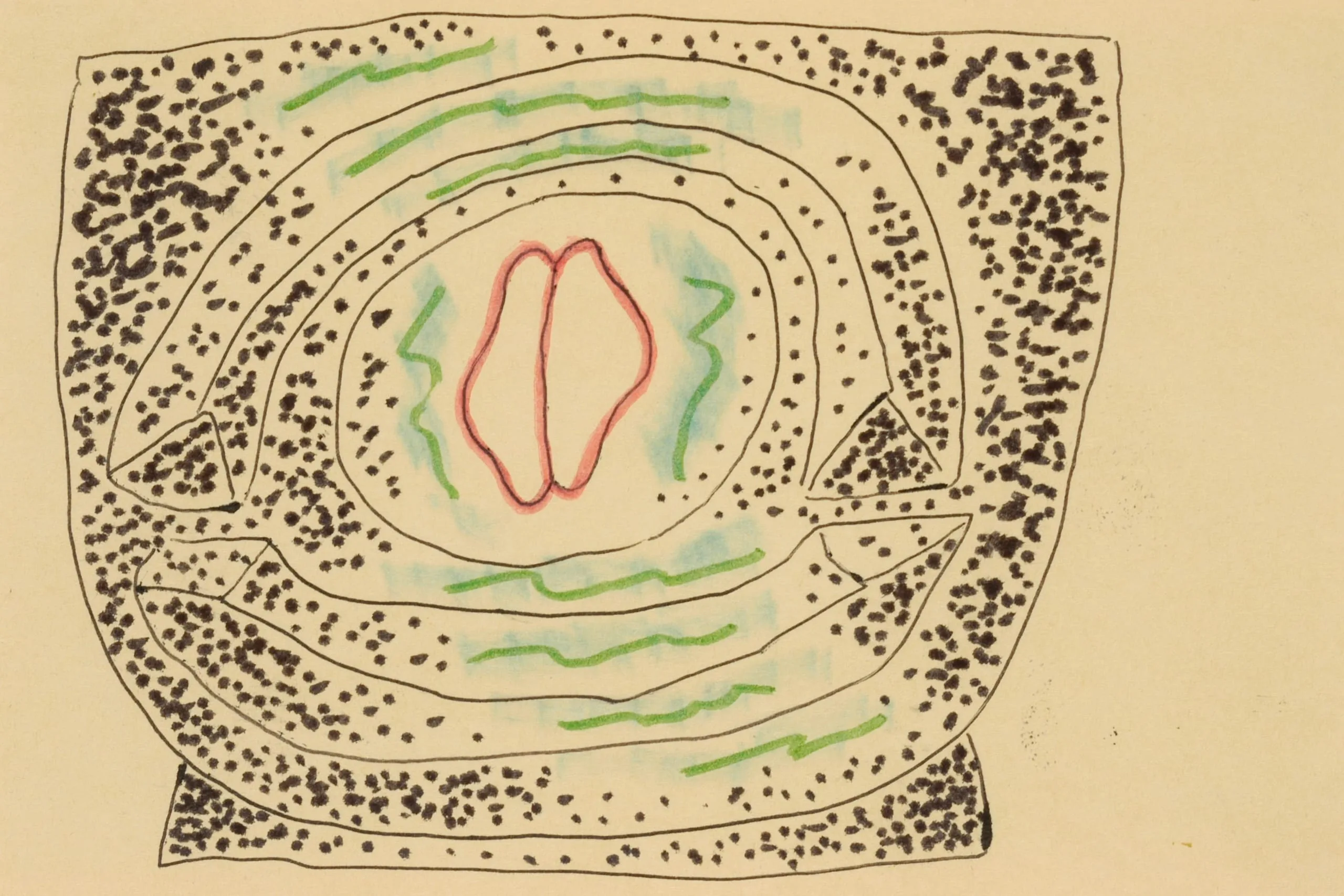 Ink and watercolor drawing of concentric irregular ovals with stippled borders, green zigzag lines, and two coral-pink petal shapes at the center